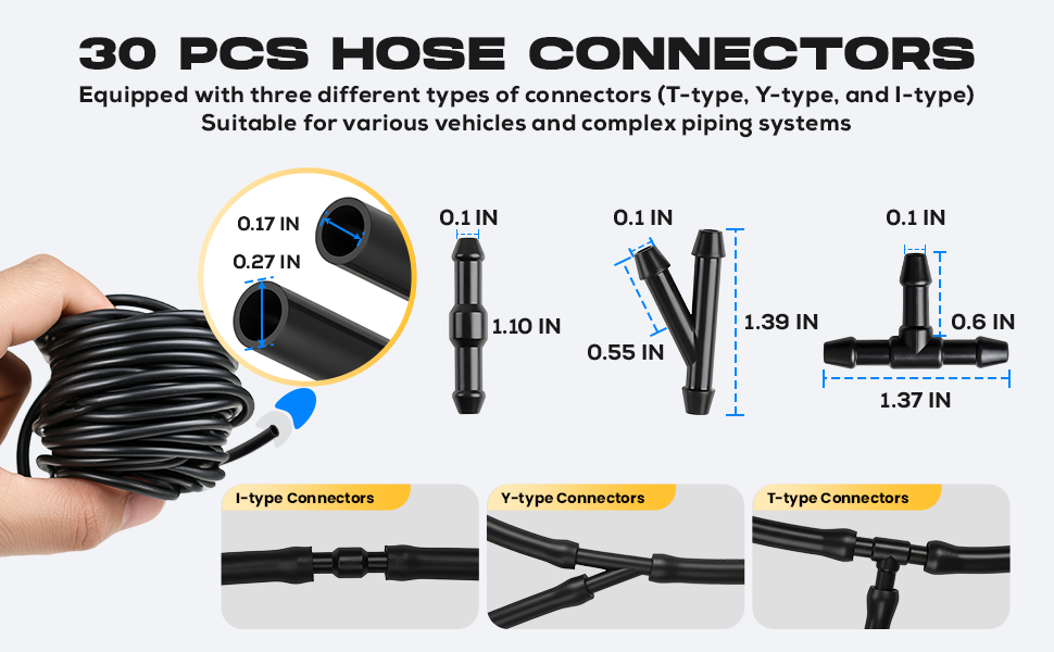 COMPLETE PACKAGE: Includes one 4-meter washer fluid hose and 30 connectors (10 Y-shaped, 10 I-shaped, 10 T-shaped); enough for immediate use and future replacement, no interruption to your windshield washer function