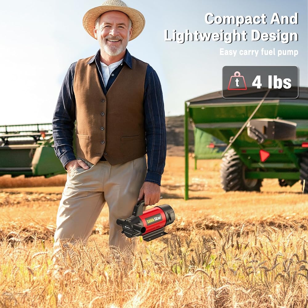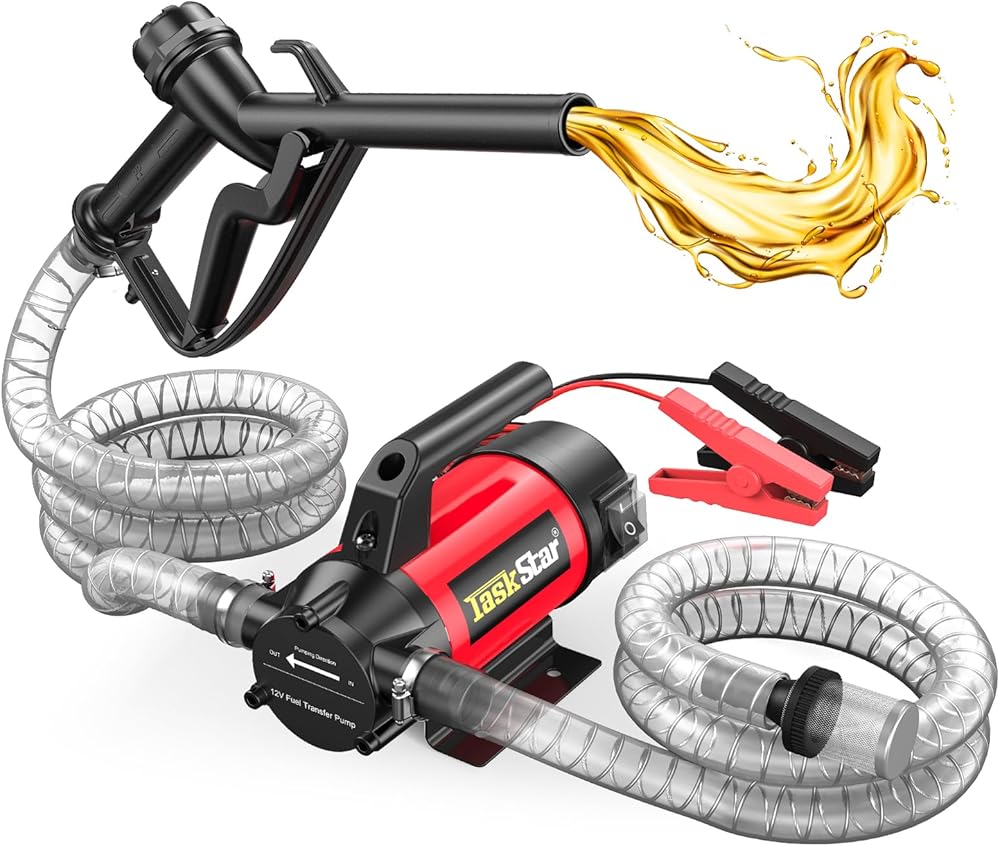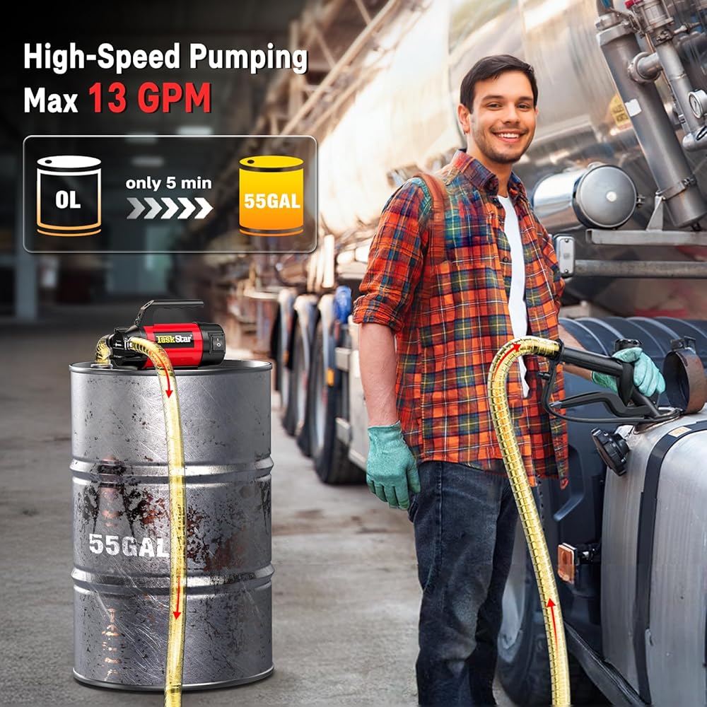 13GPM FAST TRANSFER: The TaskStar fuel transfer pump has a flow rate of up to 13 gallon per minute, allowing fuel to be transferred quickly from the tank to the equipment. Our commonly used 55-gallon diesel drum can be emptied in less than 7 minutes, significantly improving work efficiency and saving time