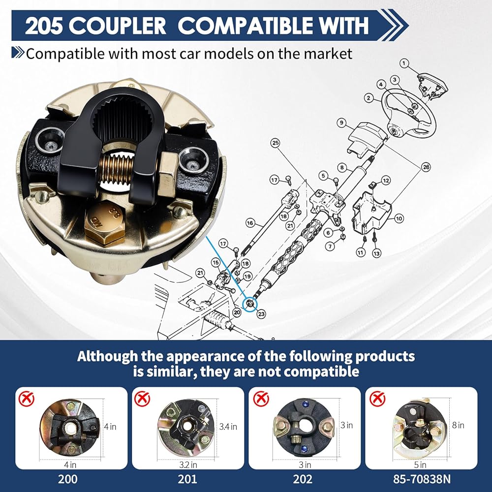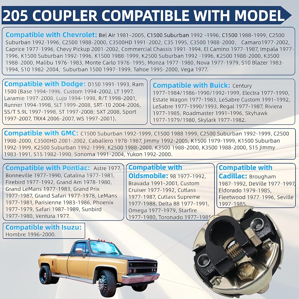 【Widely Adaptable】205 coupler assembly compatible with Chevrolet GMC Buick Cadillac Dodge Isuzu Oldsmobile,key component of automotive steering power. Before purchasing, check the model of the car and compare it with the car models in the 205 coupling adaptation list. If the model is not included in the list, it is not suitable for that model