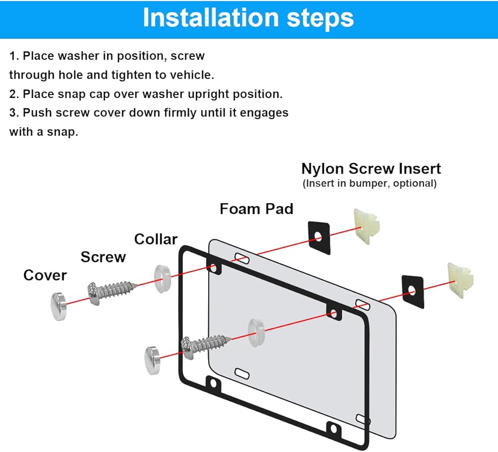 التوافق: تتضمن مجموعة براغي لوحة الترخيص التي نقدمها، مسامير براغي وصواميل تثبيت ومفك براغي وأغطية وغسالات. مسامير طويلة مقاس 1/4 بوصة × 3/4 بوصة (M6*20 مم) مناسبة للتركيب المدمج للوحة العلامة والإطار وغطاء معظم الدراجات النارية والسيارات والمقطورات والشاحنات. تناسب البراغي ذاتية اللصق معظم فتحات لوحة ترخيص السيارات والشاحنات المحلية التي تستخدم مثبت النايلون/البلاستيك. نحن نقدم إضافات من النايلون لضبط حجم فتحات المصد المحفورة مسبقًا.