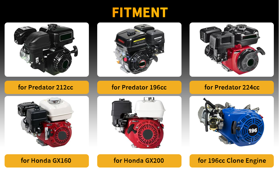 Direct Drop-In Fit: Fits for Predator 196cc 212cc 224cc 6.5HP Hemi / Non-Hemi; for Coleman CT200U BT200X CT200U-EX mini bike; KT196; Tillotson 212R Engine; GX160 GX200 Clone Engine 6.5HP/7HP and all non Hemi 6.5 HP clones—no machining or spacers required