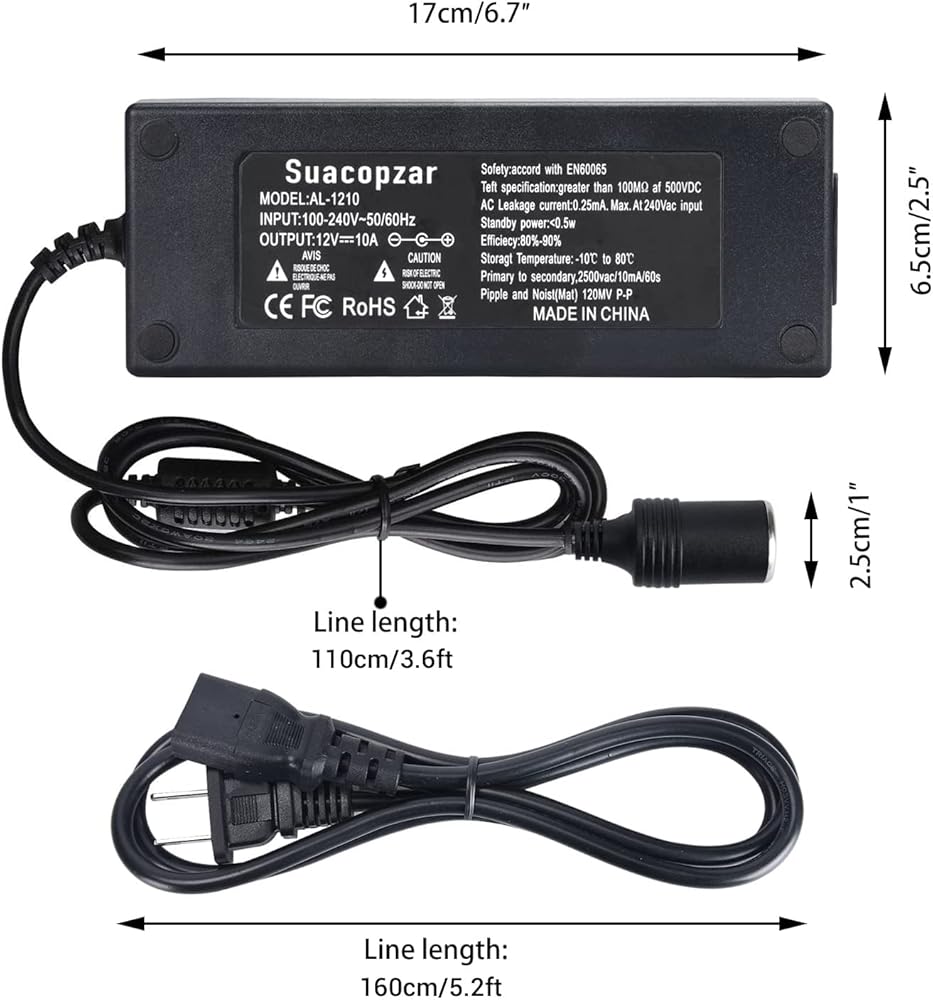 Input: AC 100-240V 50/60Hz; Output: DC 12V 10A; Standard US 2-Pins Plug & Female Car Cigarette Lighter Connector. (Please check the power input connector of your device. It should be standard male car cigarette lighter plug.)