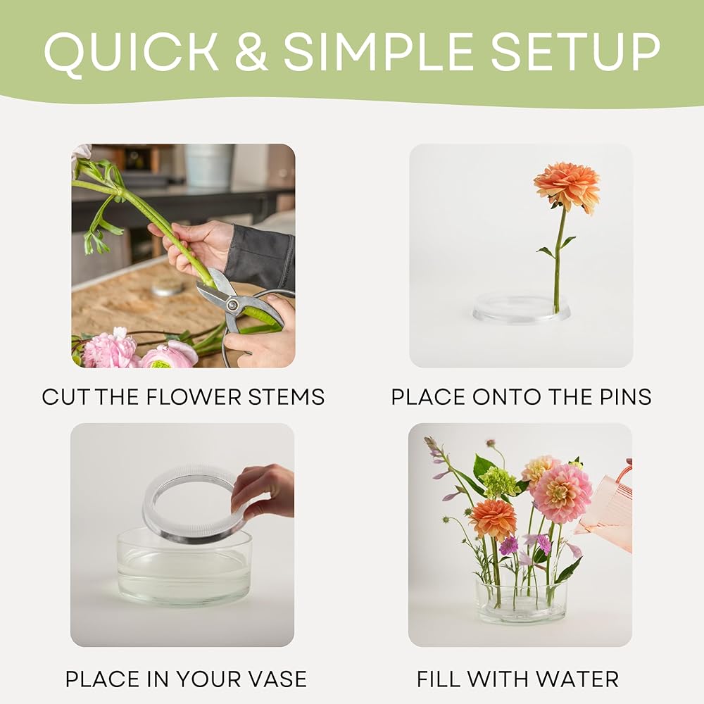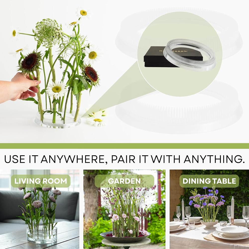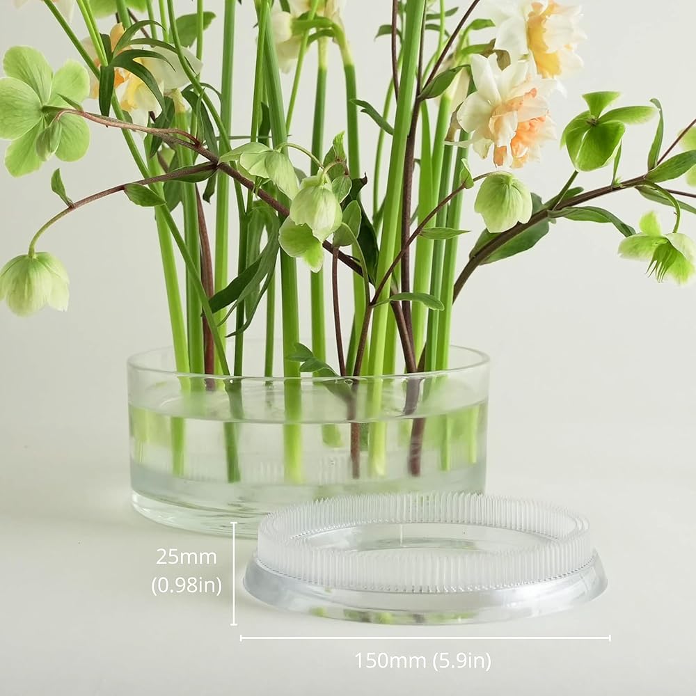 Discover the future of floral arranging with the Hanataba 150mm Clear Acrylic Flower Frog Ring – a modern, minimalist alternative to traditional kenzan and flower frogs. Designed in Sweden and unique on the market, this transparent floral arranging ring offers maximum creative freedom with minimal visual interference. Crafted from high-quality acrylic plastic, this 5.9” (150mm) round flower frog is lightweight, durable, and nearly invisible in water. Unlike metal pin holders or suction-based frogs, this design features integrated pins that hold flower stems securely in place without damaging your vase or disrupting your aesthetic. Simply trim your flowers, press them onto the built-in pins, place the ring in your vase or bowl, pour in water, and enjoy a clean, balanced floral display. Whether you're practicing Ikebana, styling a wedding table or decorating your home, this acrylic kenzan-style ring is perfect for creating elegant, floating arrangements without the need for floral foam, tape, or wire grids. Its wide diameter makes it ideal for more spacious designs, while its clear structure blends seamlessly into any color palette or setting. Perfect for florists, event planners, hobbyists, and anyone passionate about floral design. Plus, it comes packaged in a matte black eco-friendly box – making it a premium gift for creatives and flower lovers alike.