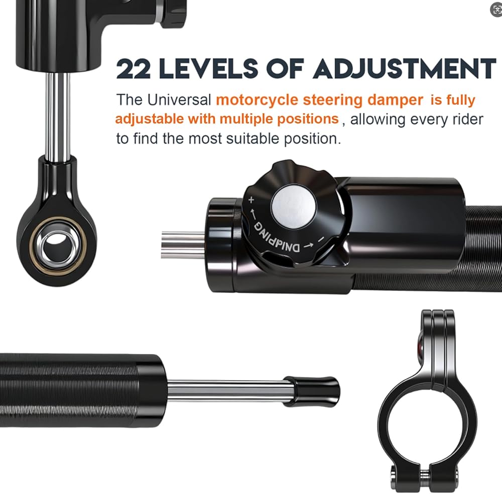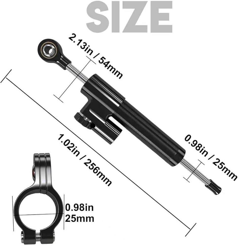 【MATERIAL】Crafted from premium CNC machined aluminum alloy our universal damper boasts exceptional durability and a sleek finish This high quality construction ensures superior rust resistance making it an ideal motorcycle steering damper robust scooter shifter damper reliable mini bike steering stabilizer and a long lasting steering damper kit for electric scooter