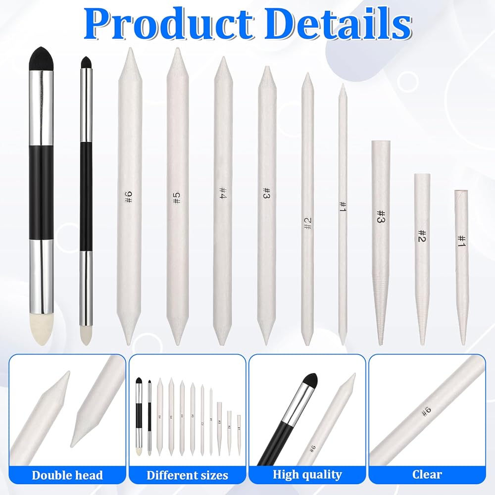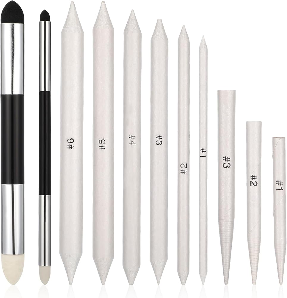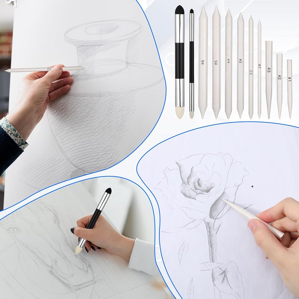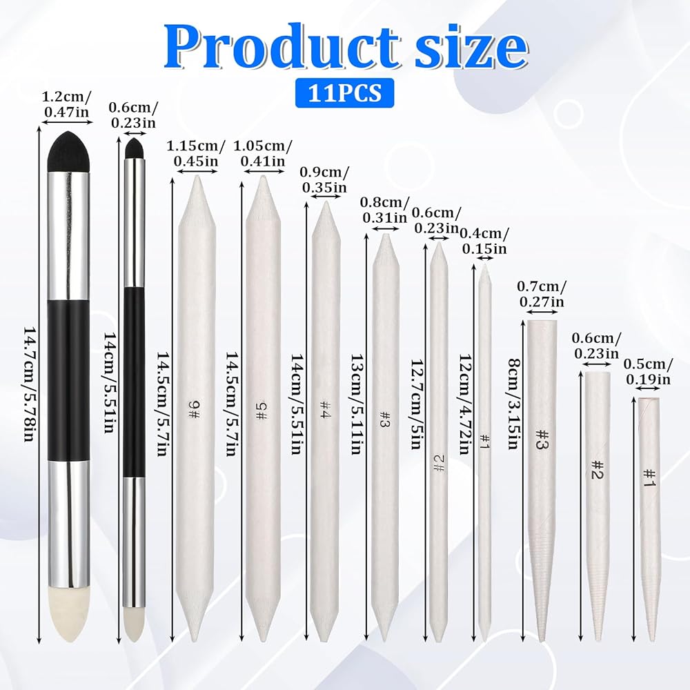 11-Piece Blending Tool Set: You'll receive 6 blending pencils (sizes 1 to 6), 2 smudge sponge pens, and a sandpaper sharpener. This versatile set is perfect for sketching, shading, and blending with charcoal, graphite, or pastels