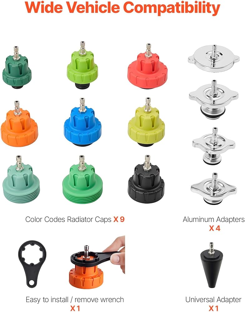 Universal Vehicle Compatibility: The coolant pressure tester kit comes with multiple adapter sizes and corresponding numbers on the packaging for easy identification. Compatible with most cars, SUVs, and light trucks, including BMW, Ford, Fiat, Volkswagen, Porsche, Mercedes-Benz, Nissan, and other mainstream brands
