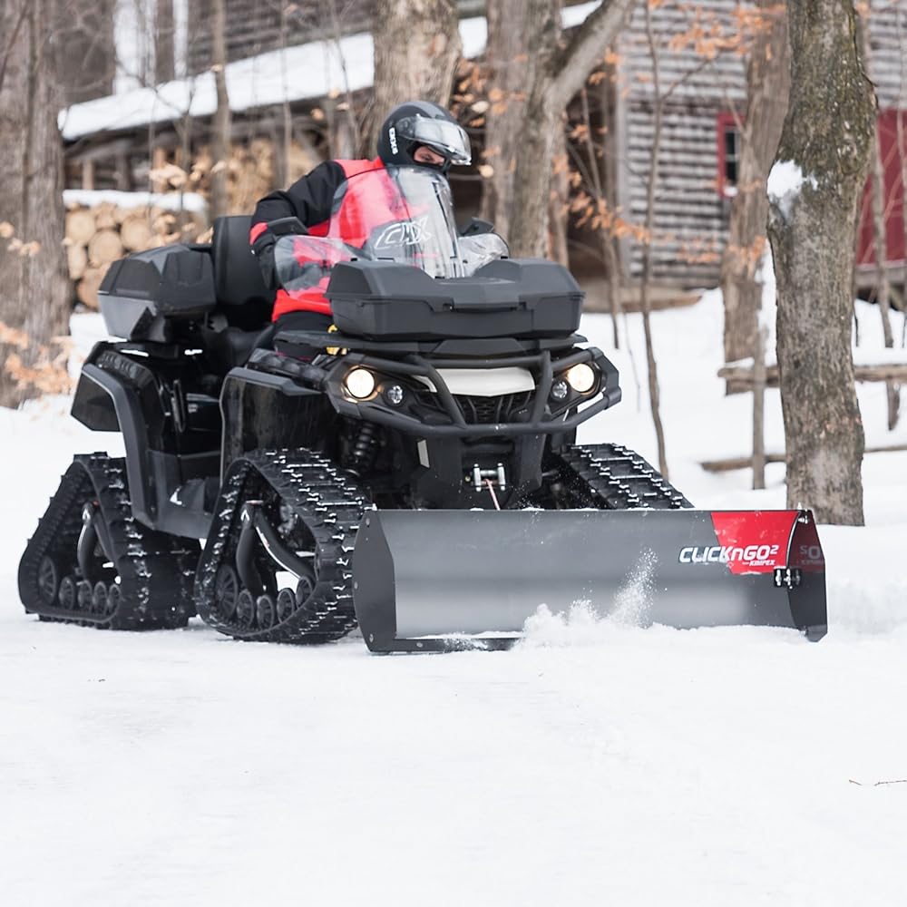 Click N Go2 ATV Plow System. Features a double pivot point that increases lift height by 75%. Driver can use pedals to deactivate the latch and change the plow angle. Quick hitch system makes for easy plow mounting. Universal mount plate works for most ATVs. Several plow sizes available. Wider plow bracing for more rigidity. Higher blade pivot point increases efficiency. Compact system design. NOTE: Machines with track kits will require frame extension PART #4501-0716..