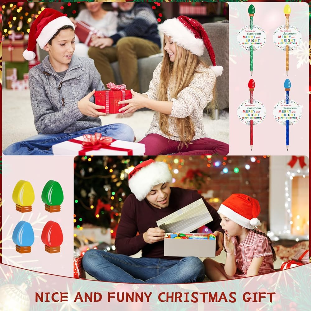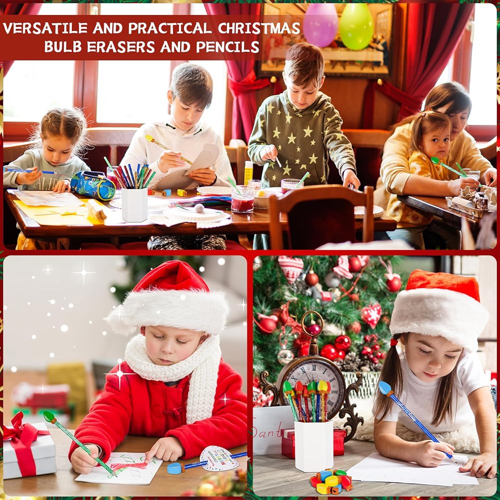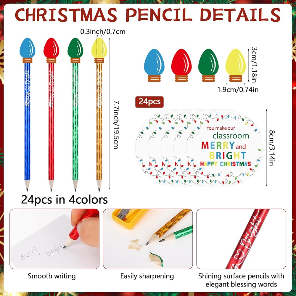 • 【Christmas Themed Gift】Our Christmas gift set includes 24 premium pencils, 24 mini bulb shaped eraser toppers, and 24 round festive merry bright cards, all designed to bring holiday cheer to any paties or home activity. The pencils feature a classic Christmas color scheme of red, green, yellow, and blue, while the erasers are shaped like cheerful light bulbs and in beautiful red, blue, green and yellow colors, embodying the spirit of the season.