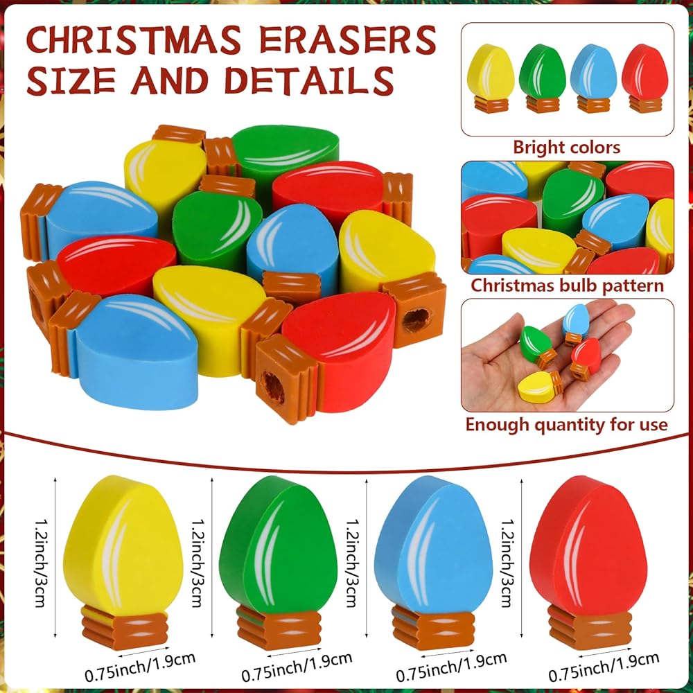 24 Sets Christmas Pencils Erasers Gifts with Bulb Christmas Pencil Eraser Toppers Merry Bright Cards Bags, Mini Lightbulb Erasers Multicolor Tiny Erasers for Party Rewards Xmas Gifts