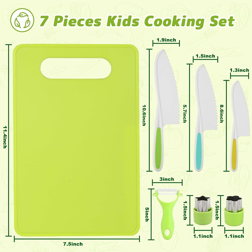 7 Pcs Montessori Kids Knife Set for Real Cooking, BPA Free Kitchen Cooking Tools Toys for 3-12 Year Old Boys Girls, Toddlers Knife Set with Peeler, Cutting Board and Cookie Cutter for Kids Gift