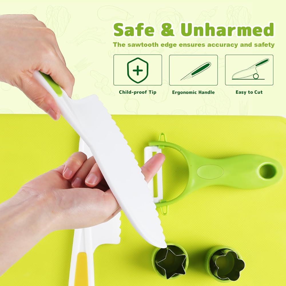 【Ergonomic Design for Little Hands】We understand the importance of comfort and safety, which is why our kitchen tools for toddlers boast an ergonomic design that fits great in small hands. Whether it's a toddler chef knife for the youngest or a children's knife set for real cooking for older kids, each piece is tailored for age-appropriate use