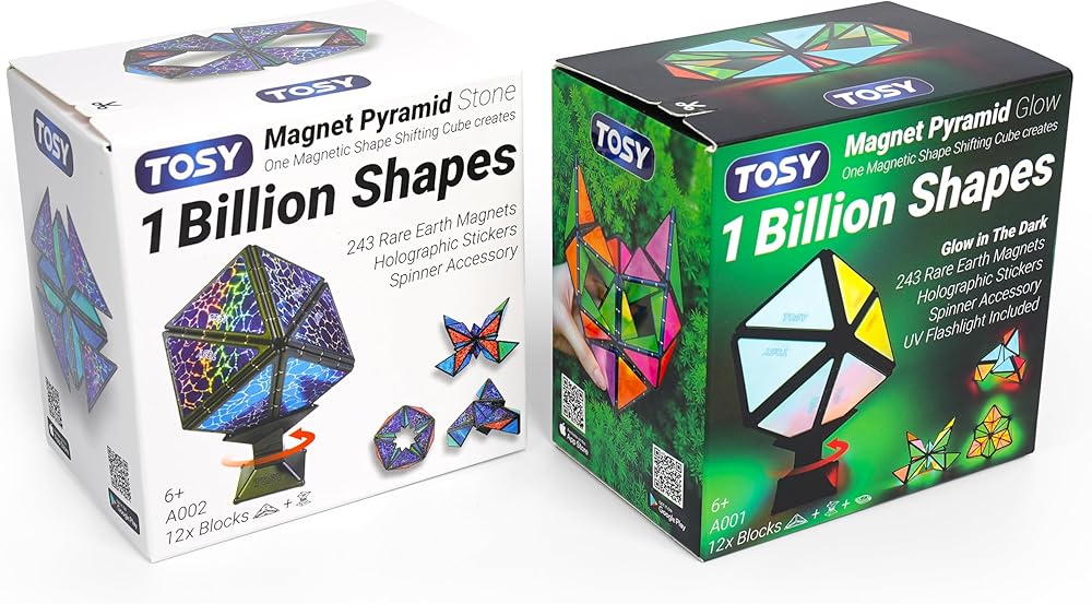 1 BILLION SHAPES - Featuring 243 rare earth magnets, the patent-pending TOSY Magnet Pyramid helps you unlock your endless creativity and relaxing your mind. The included spinner accessory gives you even more possibilities for innovative transformations