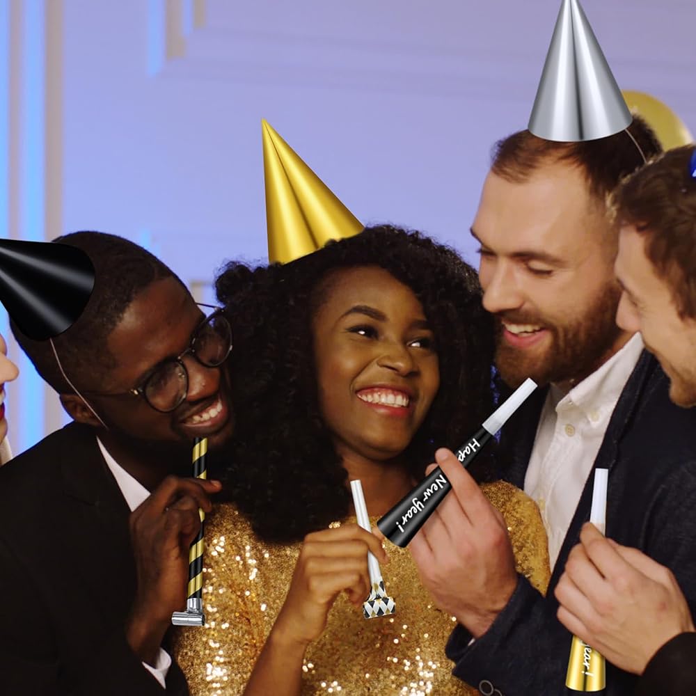 Safe to Use: our noise makers party favors are made of metal foil and plastic, finely cut, not easy to break, and can easily create joyful sounds; Use these sound makers with other New Year's Eve party supplies and accessories, perfect for creating a strong festive atmosphere on your 2025 New Year decorations
