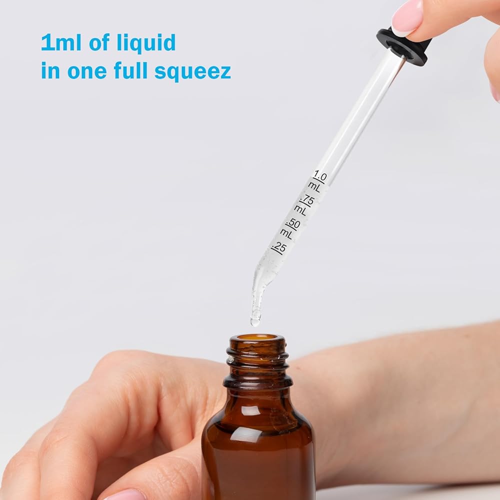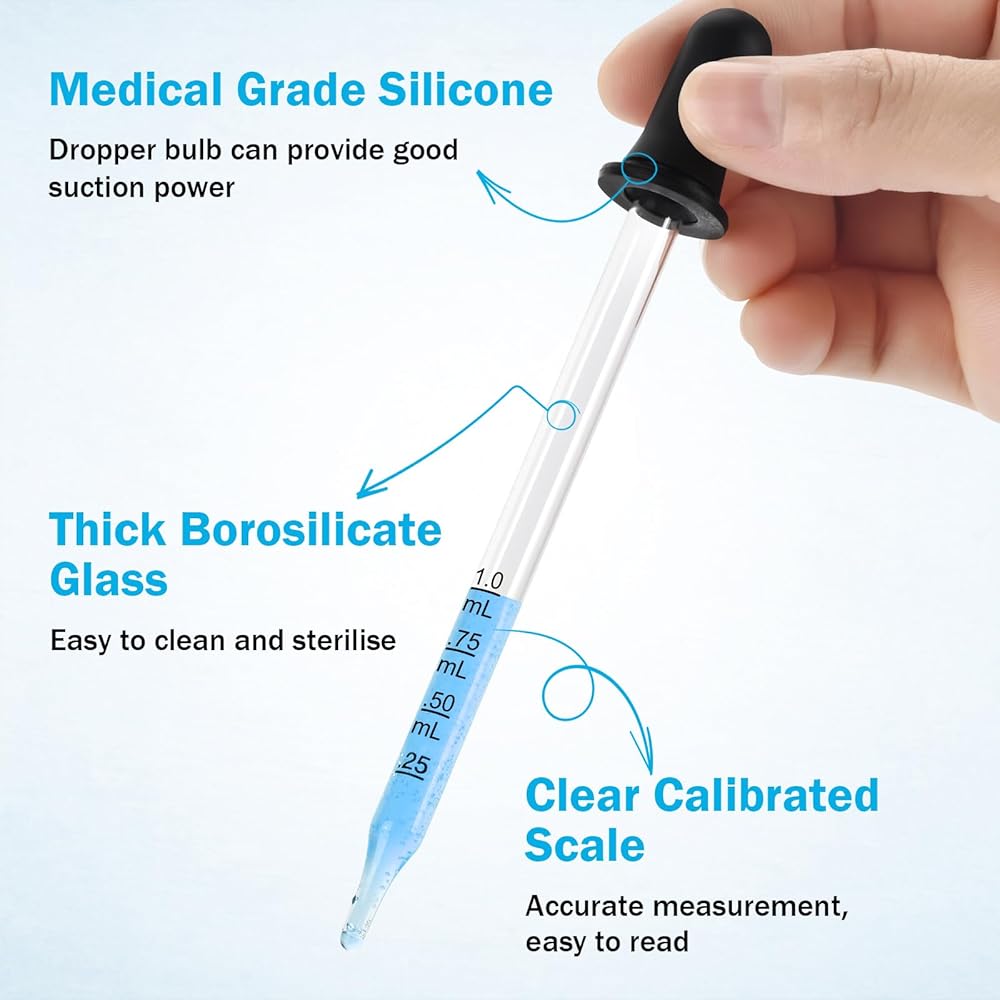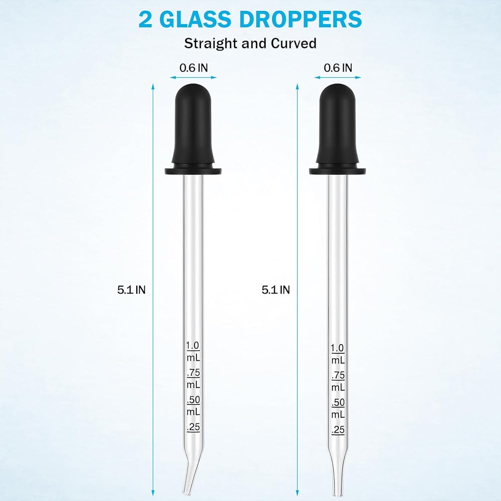【High quality material】The dropper bottle body is made of high gloss glass to measure oil and liquid easily and accurately, the bulb of the dropper is made of natural rubber to provide good suction to retain the liquid in the dropper.