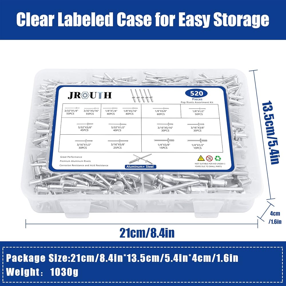 【520PCS 14 COMMON SIZES】This rivets assortment kit includes 520pcs 14 most sizes for your various daily needs.Including 50pcs (3/32” x 1/4”), 55pcs (3/32” x 5/16”), 40pcs (1/8” x 1/4”), 40pcs (1/8” x 5/16”), 60pcs (1/8” x 3/8”), 50pcs (1/8” x 1/2”), 45pcs (5/32” x 3/8”), 40pcs (5/32” x 1/2”), 30pcs (3/16” x 5/16”), 30pcs (3/16” x 3/8”), 30pcs (3/16” x 1/2”), 30pcs (3/16” x 5/8”), 15pcs (1/4” x 3/8”), 10pcs (1/4” x 1/2”), total 520pcs.