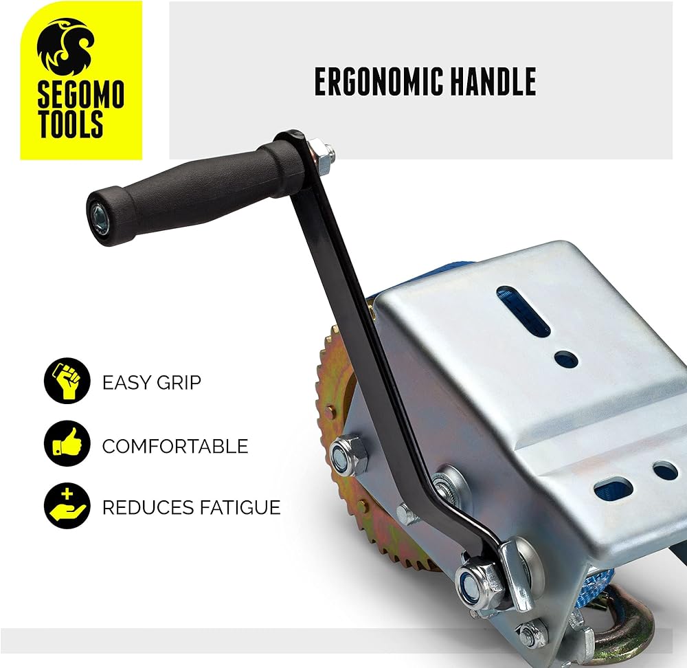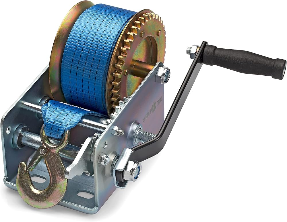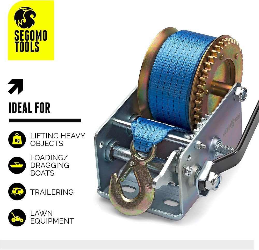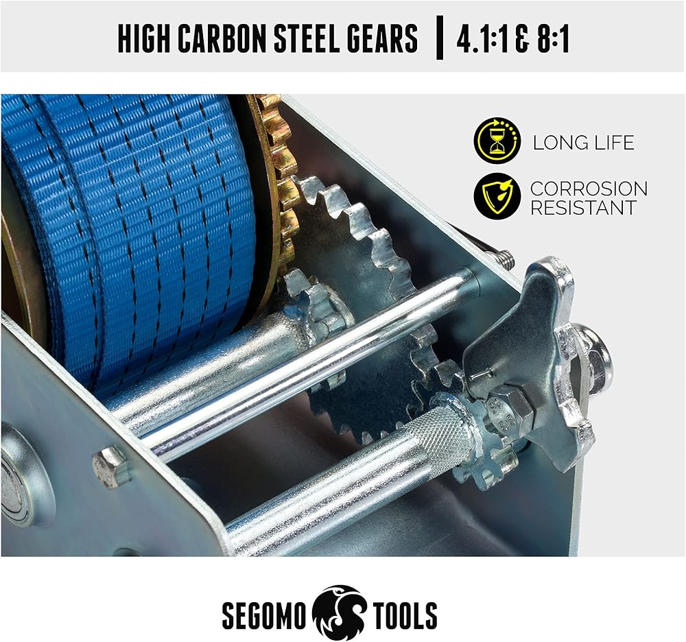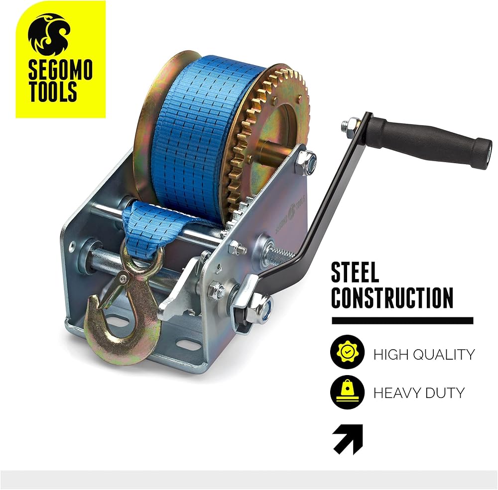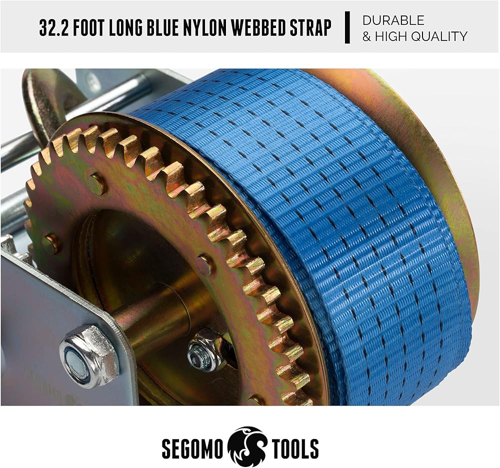 [ Hand Winch With Strap ] Durable, high quality hand crank winch featuring a long lasting 32.2 foot long blue nylon webbed strap.