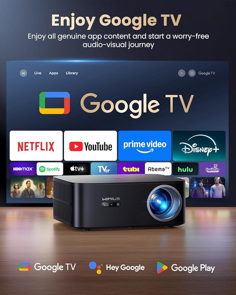 【Built with Google TV Stick/4K Supported】Smart Projector with WiFi & Bluetooth, Outdoor & Home TV Movie Projectors with Voice Control, Auto Focus & Keystone, Compatible with Netflix Proyector WiMiUS