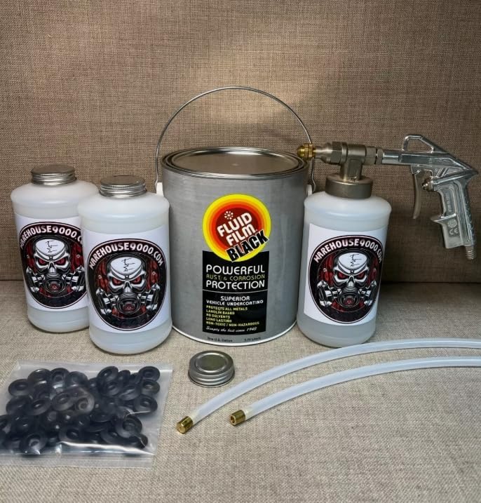 Gallon Lanolin Fluid Undercoating Film Black, Pro Undercoating Spray Gun, 2 Wands, 3 White Quart Bottles, and 50 Rust Plugs
