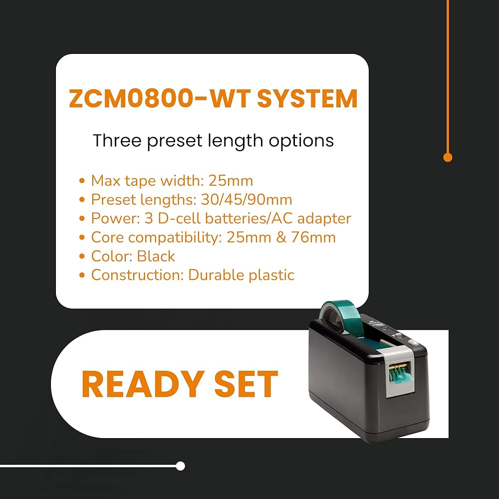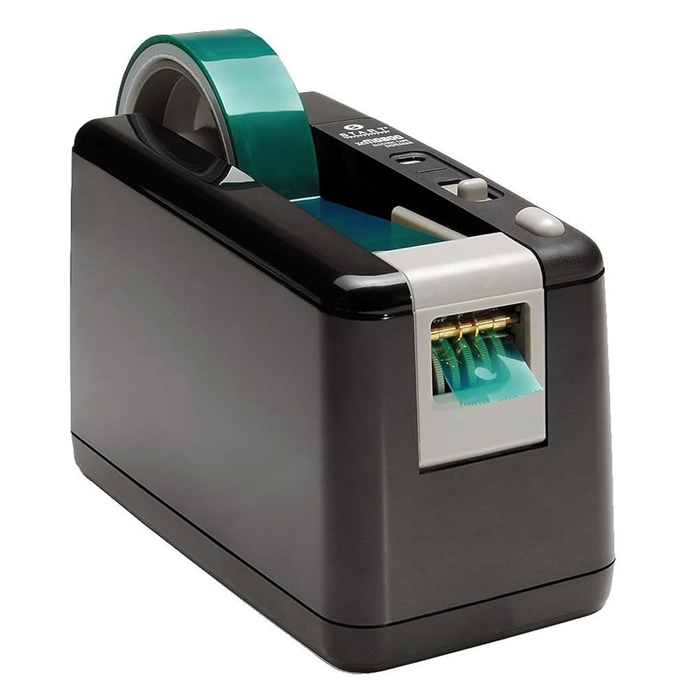 ابدأ International - ZCM0800-WT - موزع أشرطة كهربائي - آلة قطع أشرطة أوتوماتيكية مع محول تيار متردد - موزع أشرطة مكتب سطح المكتب - 3 أطوال محددة مسبقًا - تعبئة شديدة التحمل - أسود
