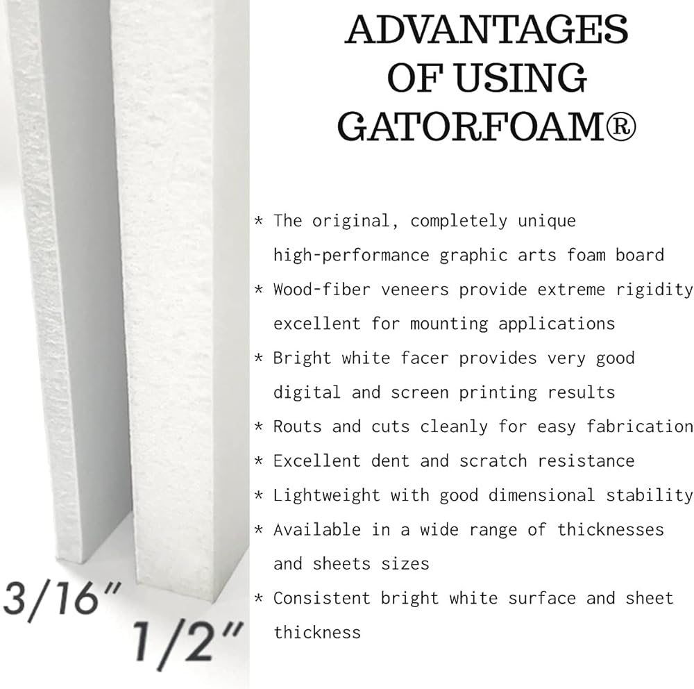 Standard thickness (3/16"). Gatorfoam foam board is an extruded polystyrene foam board bonded between two layers of Luxcell wood-fiber veneer. It's a heavy duty yet versatile foam board and is great for everything. The Gatorfoam Advantage: The original, heavy-duty graphic arts foam board. Excellent reputation for great performance. New, bright white facer is the brightest foam board of its kind and great for digital and screen printing. Recommended Applications P-O-P Displays Medium-term application life Exhibits & Kiosks Medium-term application life Framing Medium-term application life Signage - Interior Medium-term application life Signage - Exterior Medium-term application life Recommended Fabrications Mounting Digital Printing Screen Printing Painting ** Do not expose to solvent-based paints Saw Cutting Routing
