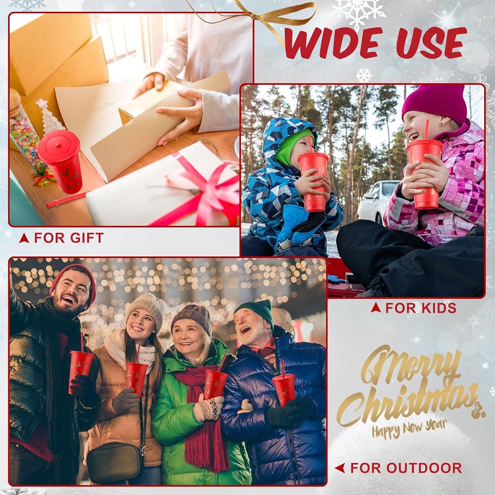 The 24 ounce Christmas cups with lids and straws are made of PP plastic material, suitable for cold drinks, so you can always take your iced coffee or hot tea with you on the road. You can take them to most occasions like parties, picnics, camping, etc.