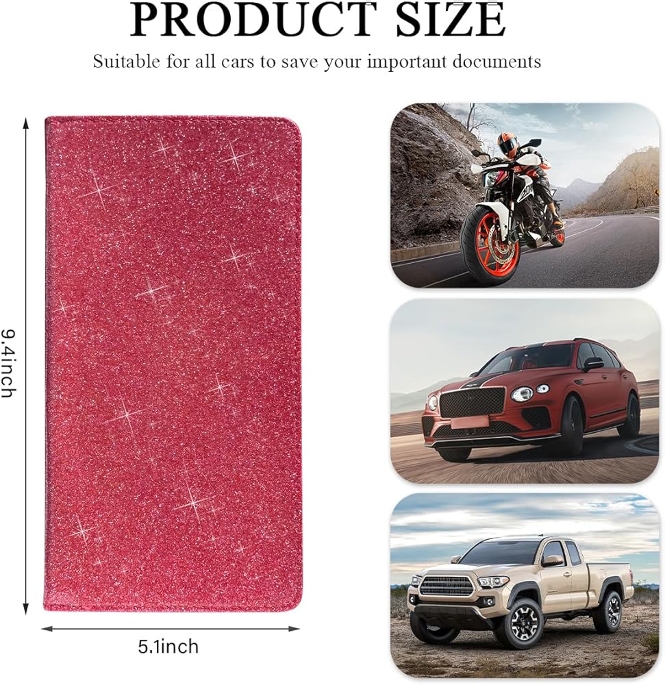 KVAEY Car Registration and Insurance Holder, Bling Premium Leather Auto Glove Box Document Organizer with Magnetic Shut, Waterproof Car Document Holder for Cards, Driver License (Glitter Pink)