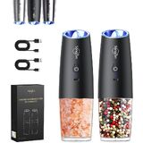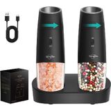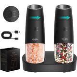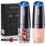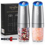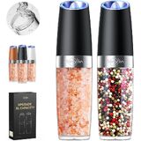 GRAVITY SENSING AUTOMATIC OPERATION - The gravity salt and pepper grinder set shakers uses advanced gravity sensing technology to provide effortless one-handed operation. Simply flip the grinder over and enjoy freshly ground spices without the need to grind manually or push buttons. Battery powered, each grinder requires 6 AAA batteries (not included). Gift this perfect set of 2 to any new home-owner, friend, family , or newlywed whose kitchen is not complete without a salt and pepper set