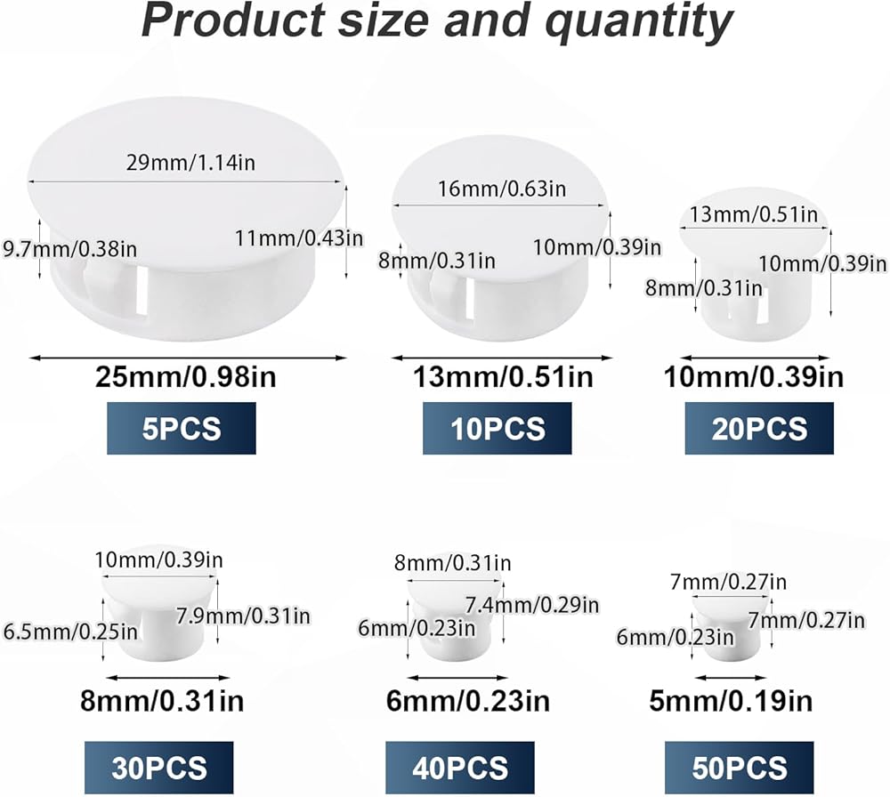 Package Contents: You will receive 155pcs plastic hole plugs in 6 sizes. Enough quantity and size to meet your daily use and replacement need.