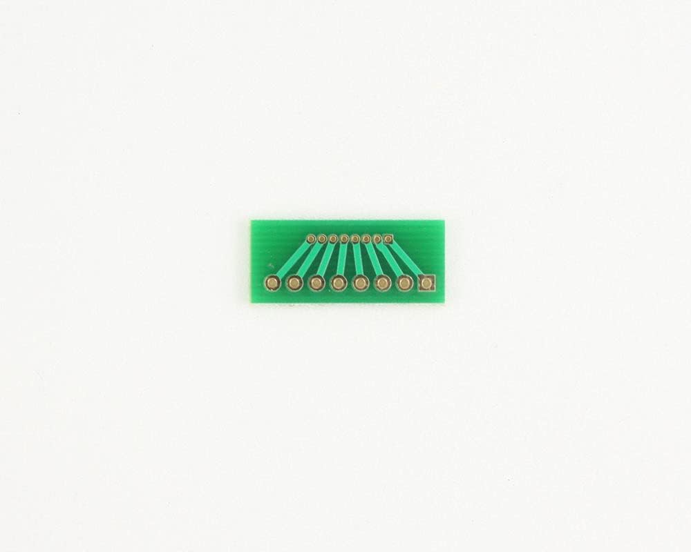 Lead-Free / RoHS 3 Compliant / REACH Compliant Through hole pitch changer. 1.27 mm to 2.54 mm (0.05 inch to 0.1 inch) pitch conversion. 8 pins. PCB Dimensions: 22.86 x 10.16 x 1.6 mm (0.9 x 0.4 x 0.0625 inches). PCB construction: FR-4 UL94V-0. PCB operating temperature range: -40C to +130C. PCB reflow maximum temperature: +260C. Pitch Adapter Hole Sizes: 1.00 mm pitch holes have diameter of 0.42 mm. 1.27 mm pitch holes have diameter of 0.64 mm. 2.00 mm pitch holes have diameter of 0.8 mm. 2.54 mm pitch holes have diameter of 1.0 mm.