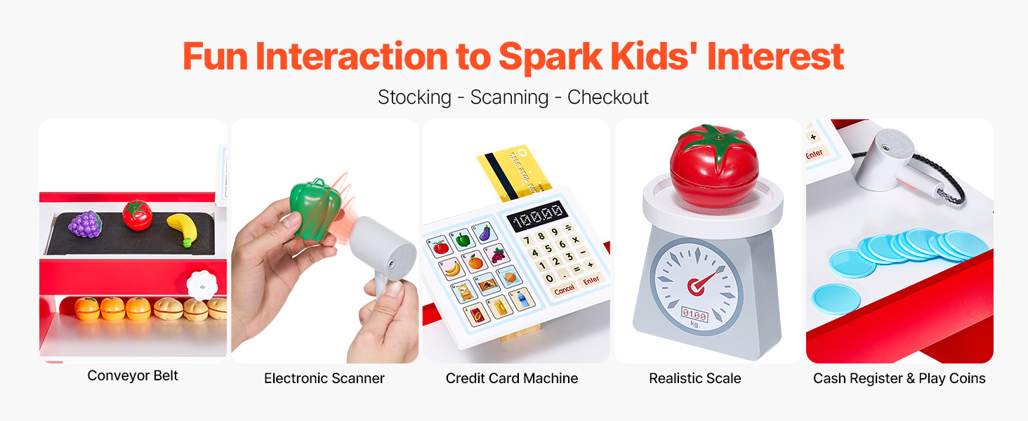 Interactive Features: Our pretend play grocery store is equipped with a moving conveyor belt, scanner, and card reader. Thus, kids can scan fruits, veggies, and checkout just like a real store.