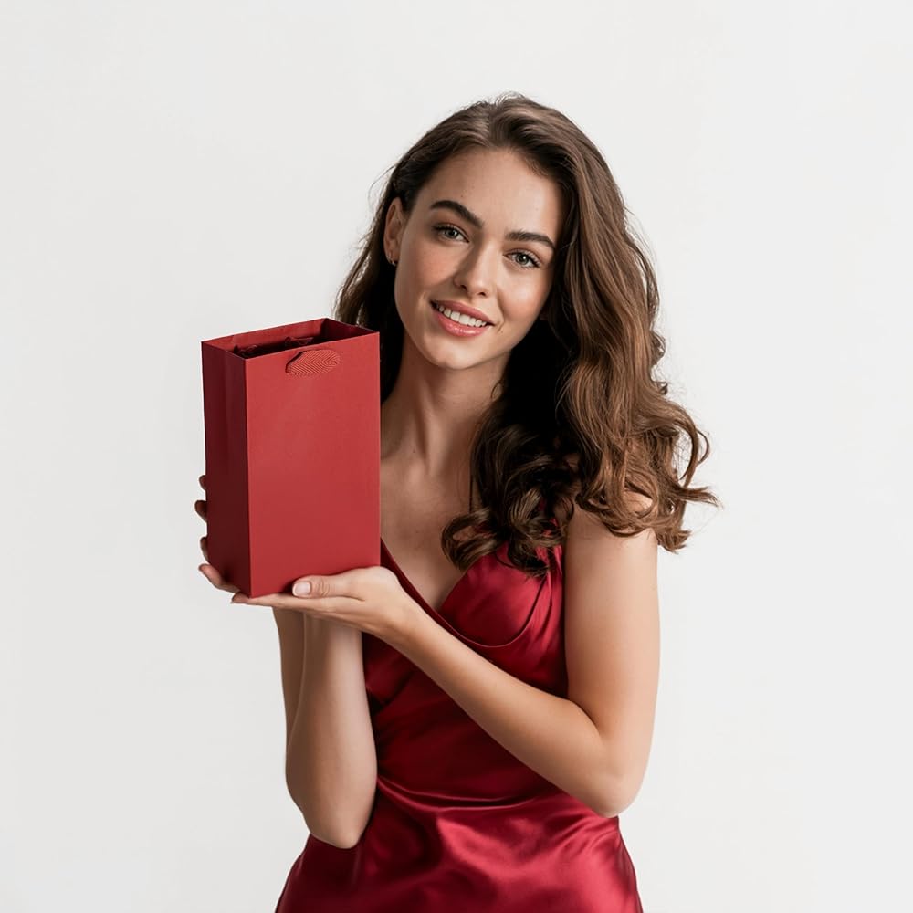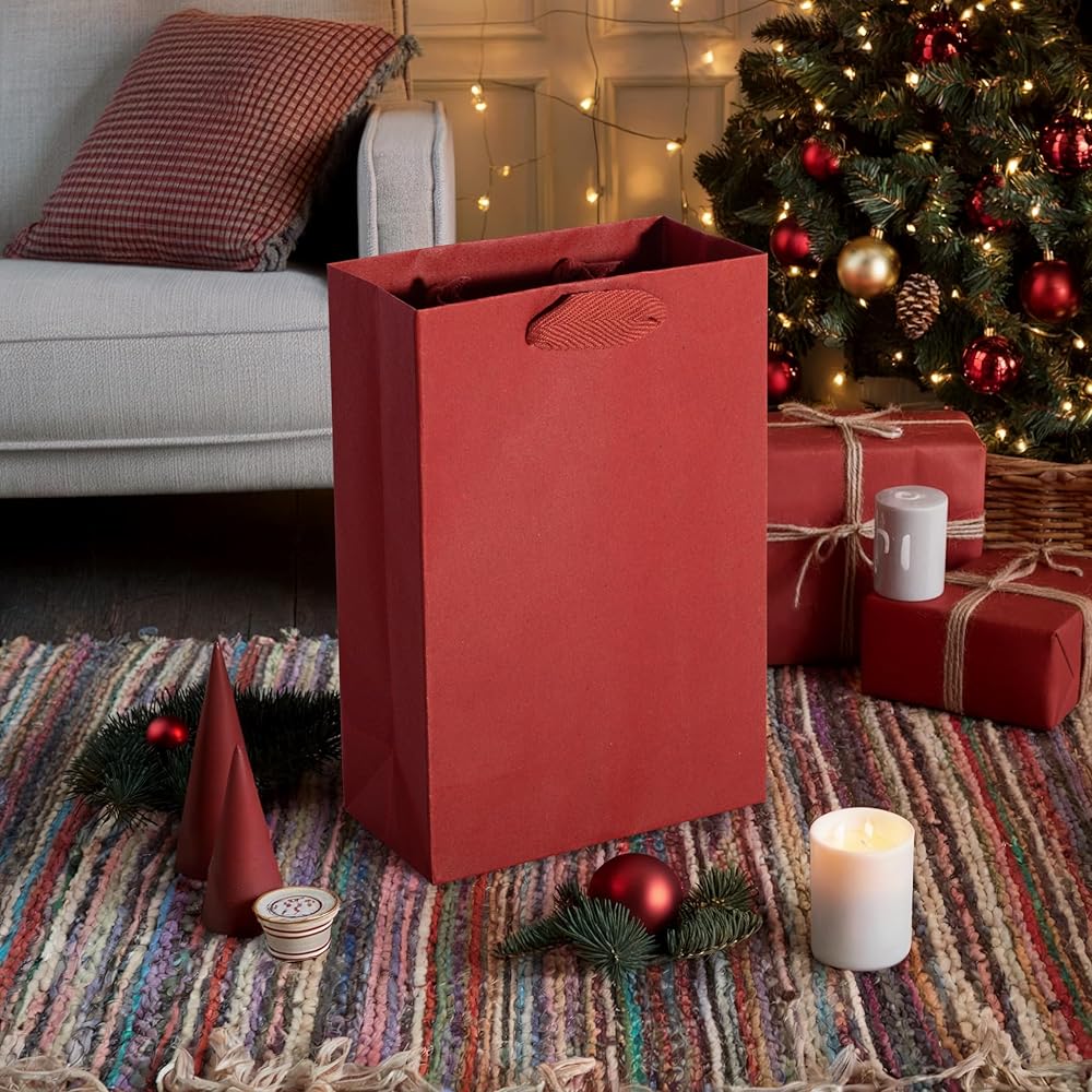 Add a festive touch to your holiday packaging with Prime Line Packaging's premium red paper shopping bags. Expertly crafted from 140 GSM recyclable kraft paper and reinforced with a sturdy 350 GSM cardstock bottom, these large bags are designed to carry gifts, holiday purchases, and event giveaways with ease and style. Each bag features 1” wide blended cotton twill handles in matching red, offering both comfort and durability while enhancing the bag's elegant, seasonal look. Measuring 16" wide x 6" deep x 12" tall, these bags are the perfect size for larger Christmas presents, bulk party favors, boutique merchandise, or festive retail packaging. Sold in value packs of 50, these red twill-handle bags are ideal for retailers, event planners, restaurants, or anyone looking to elevate their holiday presentation. The squared bottom design allows the bags to stand upright for easy filling, while the reinforced handles ensure they won't tear, even when carrying heavier items. Whether you leave them as-is for a classic holiday red look or customize them with your own branding, stickers, ribbons, or festive embellishments, these bags double as a blank canvas for creativity. Perfect for Christmas, holiday parties, or year-round use, their timeless design combines strength, versatility, and sophistication in every bag.