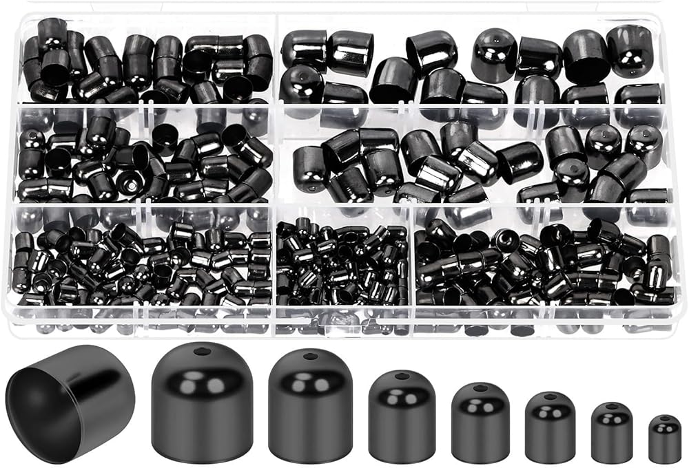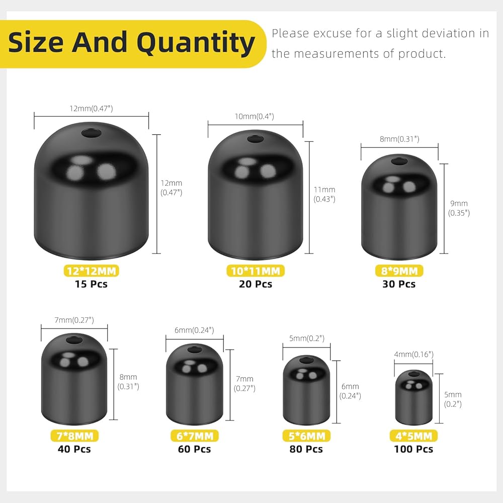 1️⃣ What You Will Get: You will get 345pcs 7 sizes metal cord end caps kit, including 100pcs 4 x 5mm, 80pcs 5 x 6mm, 60pcs 6 x 7mm, 40pcs 7 x 8mm, 30pcs 8 x 9mm, 20pcs 10 x 11mm, 15pcs 12 x 12mm, all items are packed in a plastic box for easy storage.