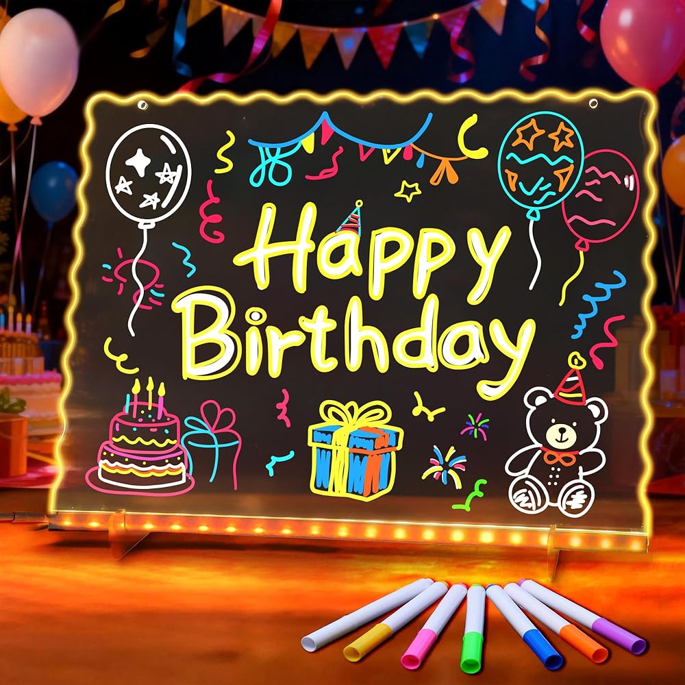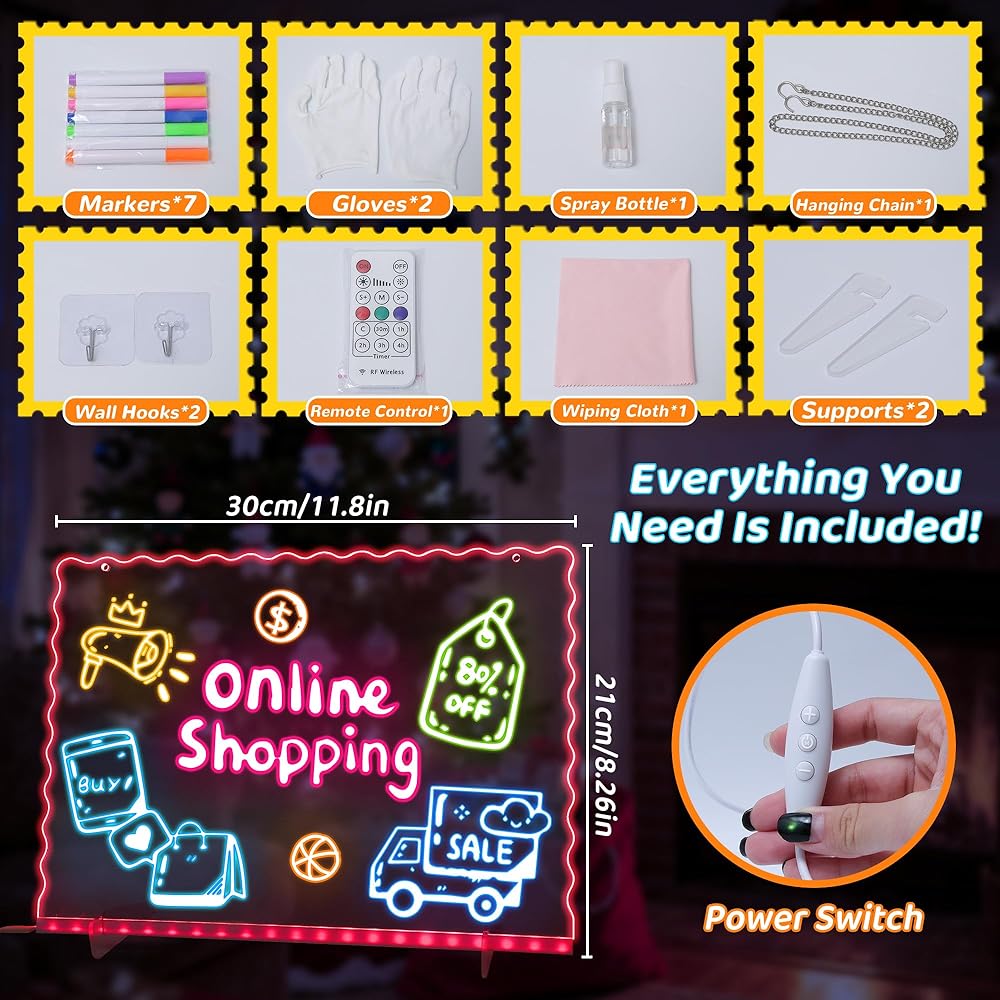 What You Get: 1 x LED light-up board, 7 x markers, 2 x gloves, 1 x spray bottle, 1 x wiping cloth, 2 x supports, 1 x hanging chain, 2 x wall hooks, 1 x user manual and friendly customer service.