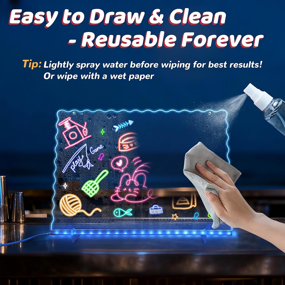 Create with light and water: Our transparent acrylic LED board glows vibrantly via USB battery power. Draw with 7 watercolor pens, spray water with the mini bottle, and wipe smoothly with the cloth. Wear gloves to keep hands clean while enjoying sensory play.