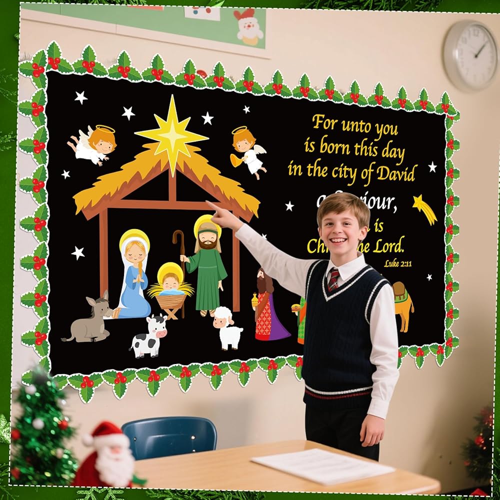 Ideal for religious spaces, schools, and community centers, this winter bulletin board Christian display not only adds beauty to your space but also serves as a poignant reminder of the birth of Jesus.