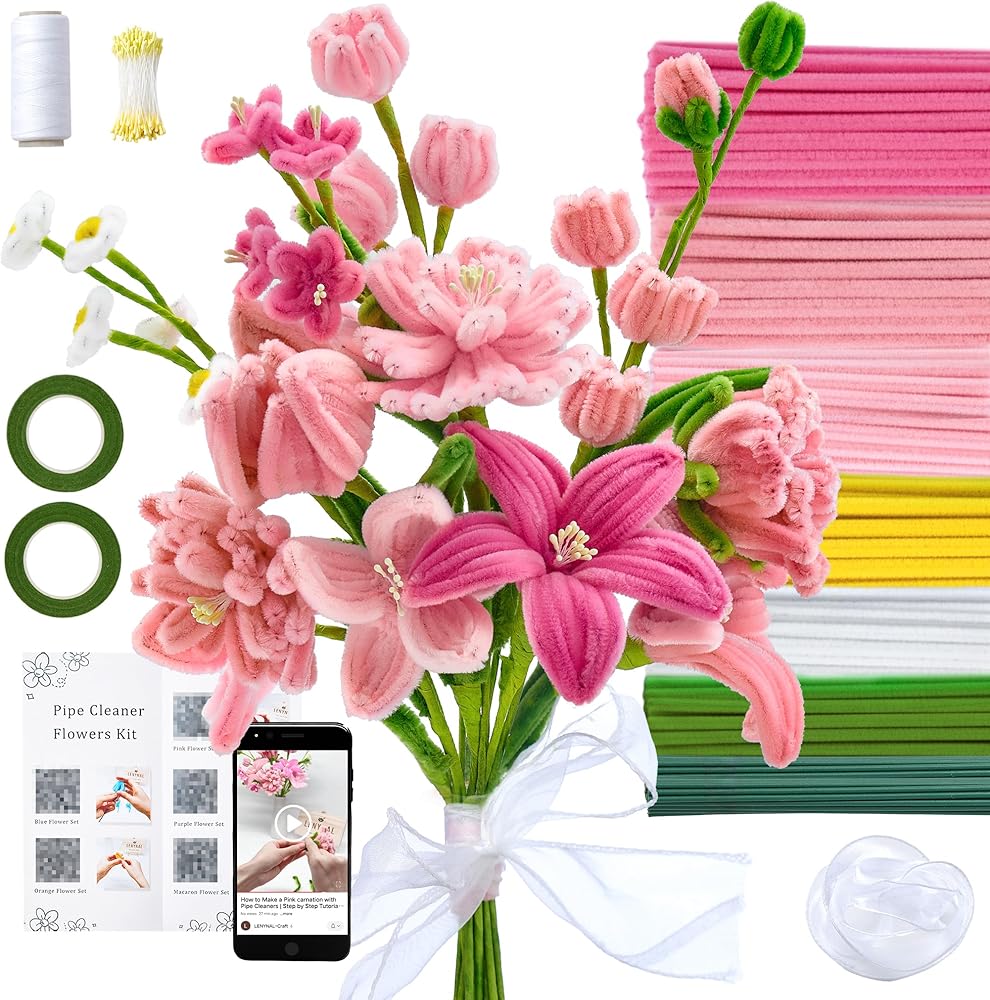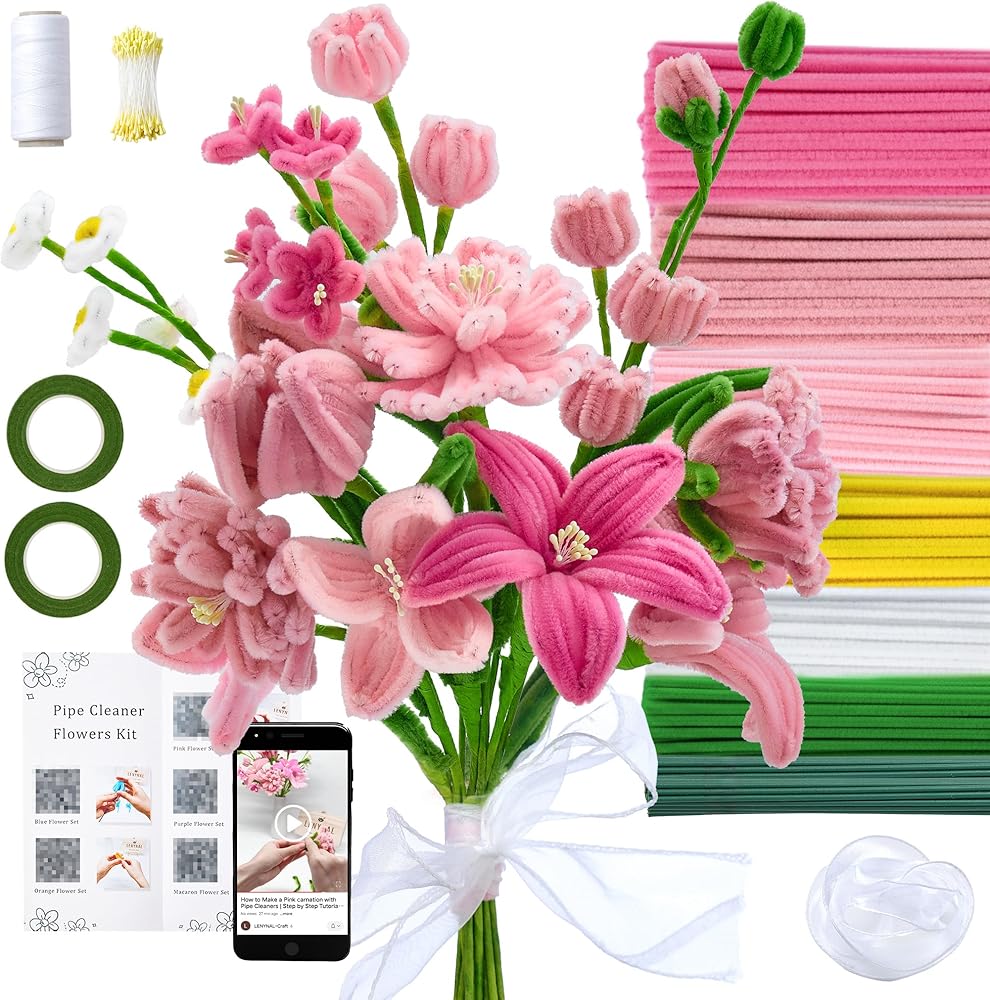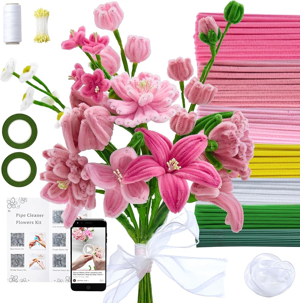 【Colorful Pipe Cleaners Flower Kit】This set comes with 6 vibrant colors and everything you need to craft flowers: 350 pink pipe cleaners in assorted shades, 50 white, 50 green, and 50 yellow, plus 2 floral tapes, 25 stems, 1 roll of elastic cord, 1 ribbon, and 100 flower stamens.
