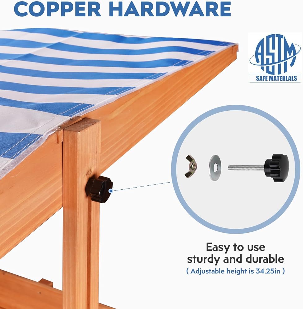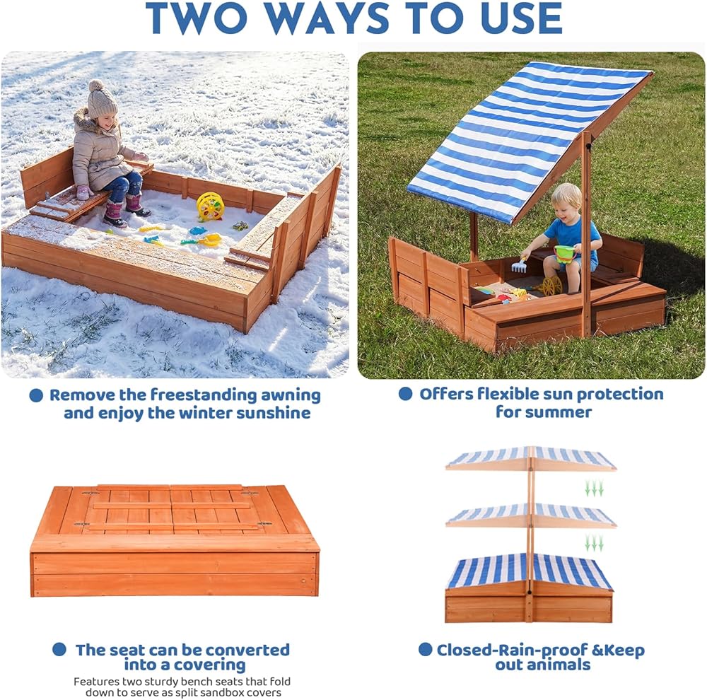 Sandbox with Cover:With a weather-resistant canopy,Feel free to adjust the height of the canopy you want according to the position of the sun allow your children to play outside with protection from the hot summer sun or rain. The benches easily fold down into a split cover to keep the sand clear of debris.