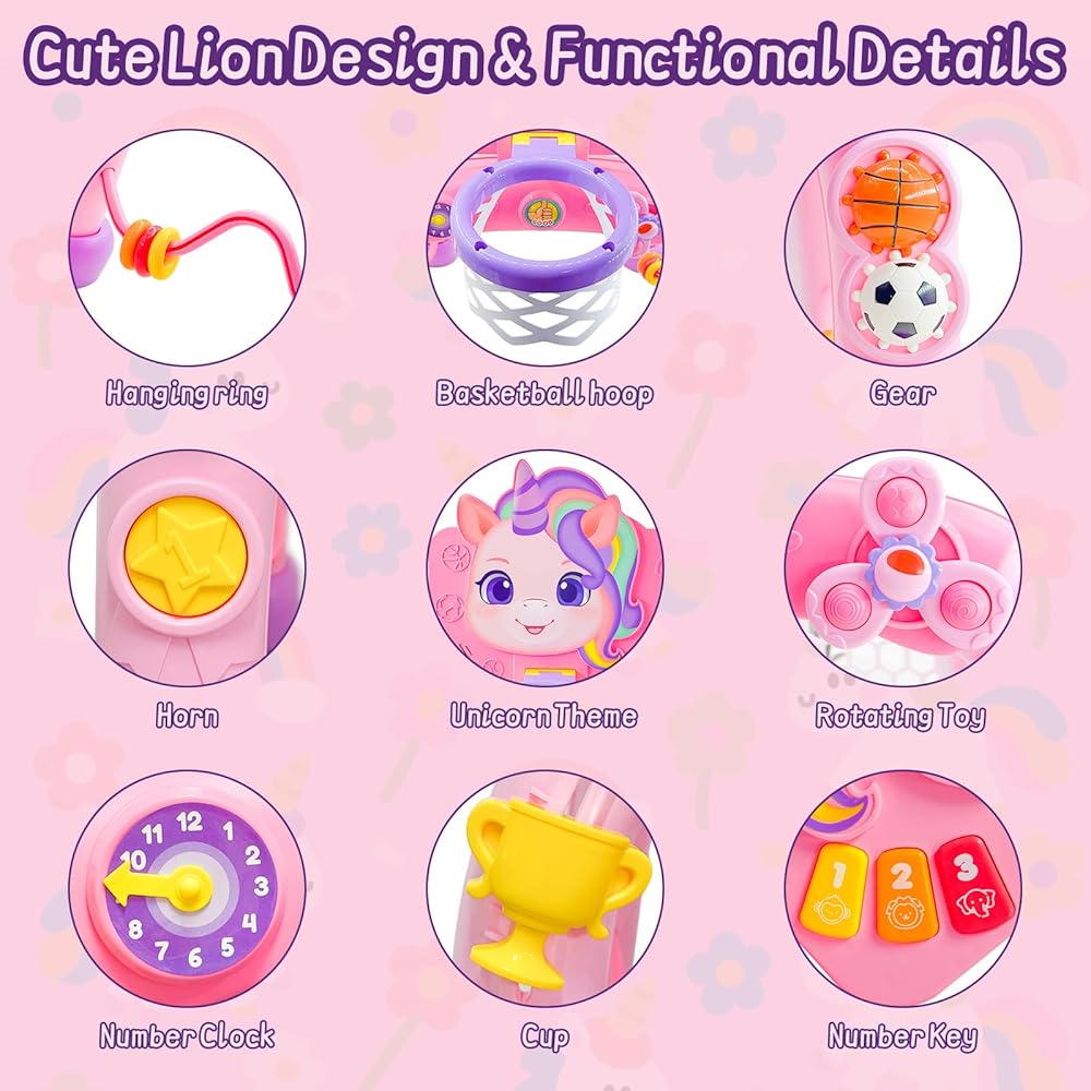 Cute Lion Shape with Music & Light: The backboard features a cute lion cartoon design and comes with music and amusing sound effects. When kids dunk the basketball or score a soccer goal, it plays encouraging sounds and phrases to celebrate their victory. The bright colors and rich details instantly catch children's eyes, stimulate their interest in playing, and encourage them to touch, observe, and explore