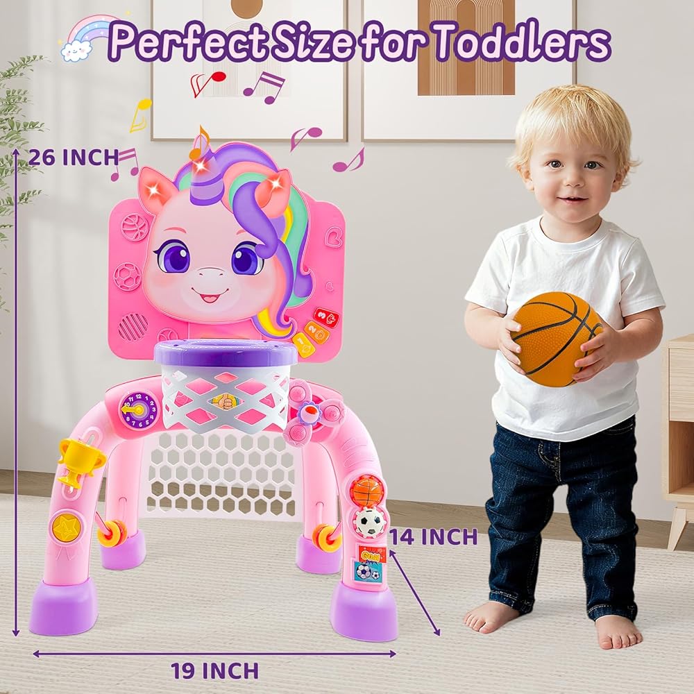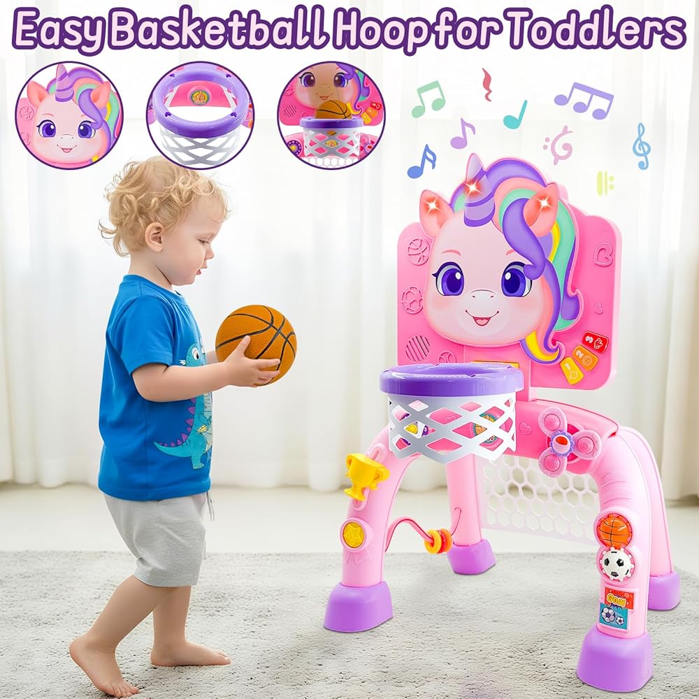 2 in 1 Basketball Hoop and Soccer Goal Set, Toddler Sports Toy for Indoor Outdoor Play, Perfect Christmas Birthday Gift for Baby Boys and Girls 1+,Unicorn Theme