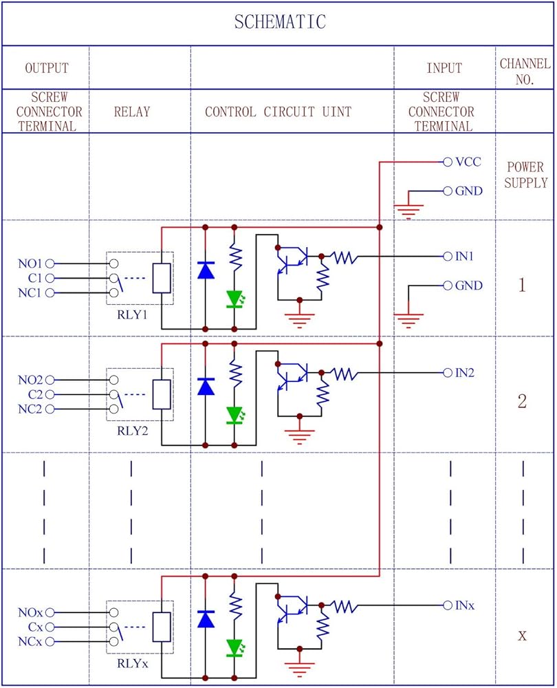 Darlington transistor circuits drive relay coil, LED indicator for each relay channel.