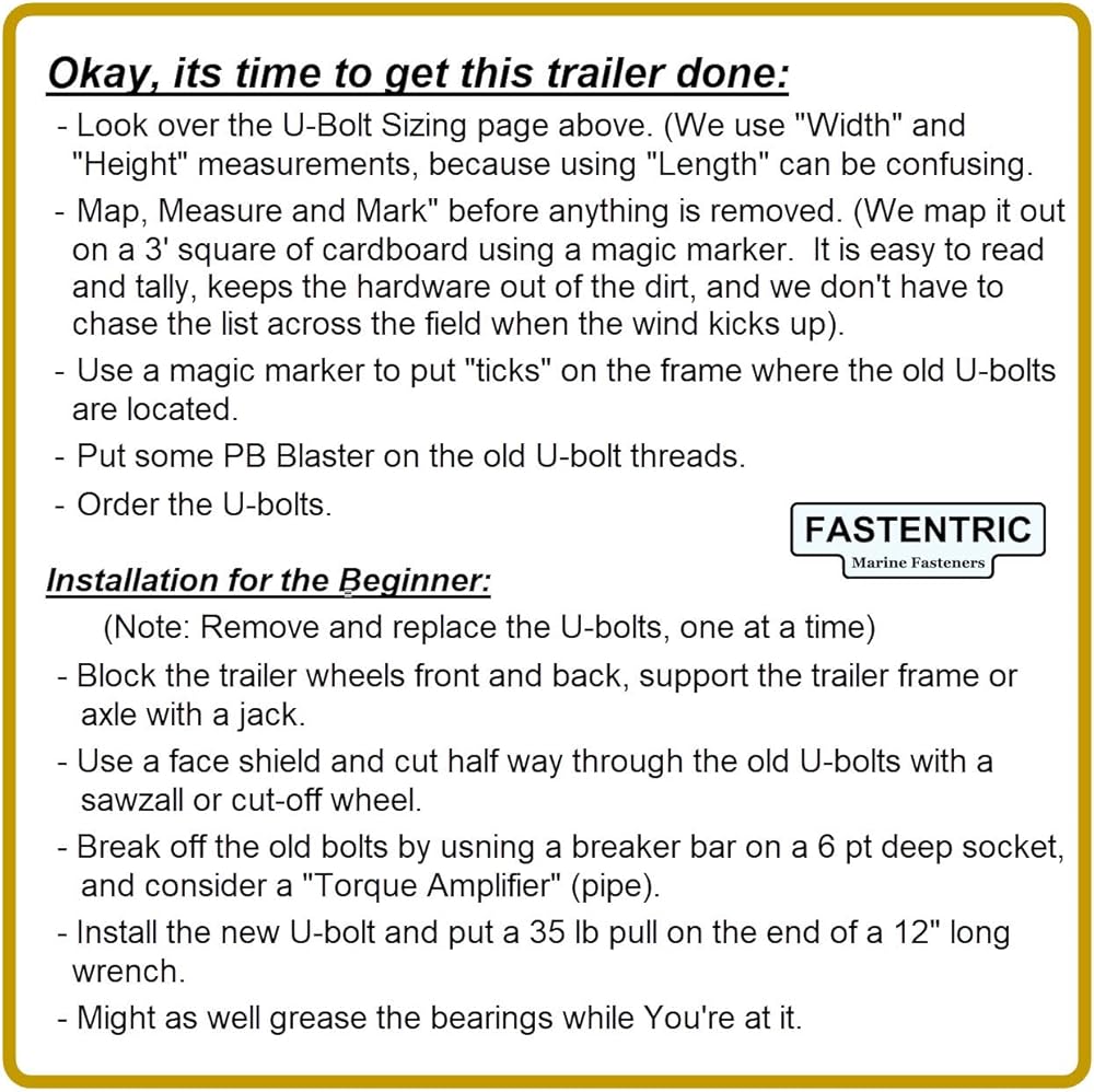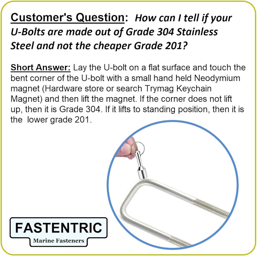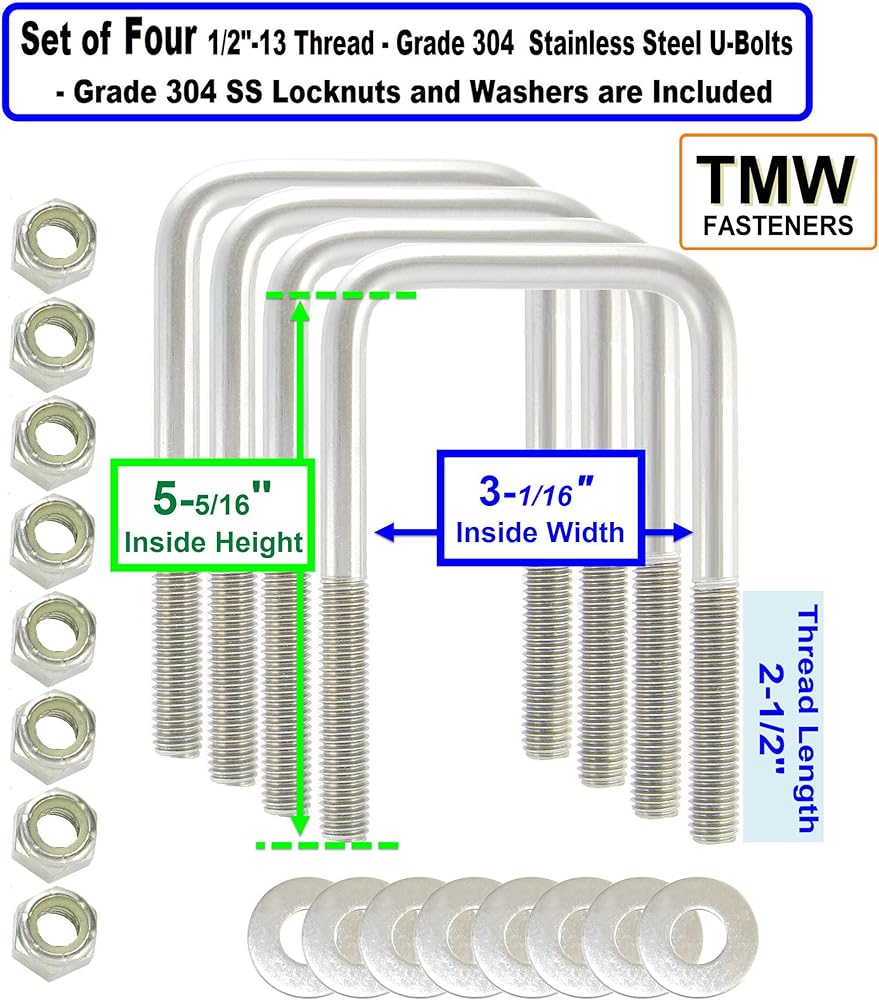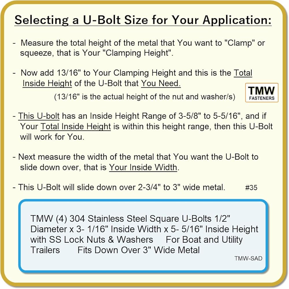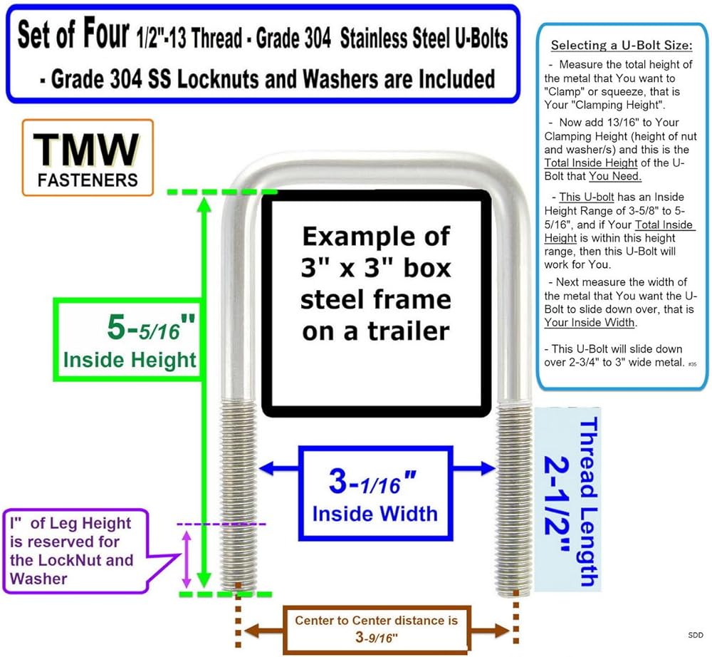 This package includes (4) Stainless Steel U-bolts and (8) Stainless Steel Flat Washers and (8) Stainless Steel Lock nuts. These U-Bolts are made in the USA out of high quality 304 Stainless Steel, and they along with the 304 stainless hardware included, hold up well in wet/salt water environments. The 3-1/16" width is the clear Inside measurement between the "Legs" of the U-Bolt. The 5- 5/16" Height is the inside dimension measurement from the top inside of the "U", to the bottom tip of the "Leg". ATTENTION: To determine the Height of the U-bolts You need, measure the total height of the metal and members to be "clamped" and add 13/16" for the nut and washers. To prevent "galling" (also known as "thread lock") use a hand ratchet or wrench to run up and tighten the nuts, do not use a an impact or powered socket driver. If a U-bolt is accidentally dropped in sand, thoroughly clean it and apply lithium grease to the threads to prevent galling. These U-Bolts will fit on 3" x 3" cross members, such as 3" x 3" box steel. Look at our other listings for multiple quantities in order to save on shipping. Magnetism: In its originally formed state 304 stainless steel is Austenitic and not attracted to a magnet but when threads are machined into the 304 U-bolt rod and the bends are formed, those areas become slightly magnetic, but they are still corrosion proof. When a 304 u-bolt is placed on a smooth surface, a strong Neodymium magnet placed at the bend of the u-bolt is able to slide or move the u-bolt, but it won't be able to lift it up off of the surface (Grade 201 Stainless Steel u-bolts can be lifted up off of the surface with the same Neodymium magnet). Grade 304 Stainless steel is also referred to as "18/8" because it contains 18% Chromium and 8% Nickel which is twice the amount that is in it's less expensive, and less corrosion resistant cousin Grade 201. SAD-RG