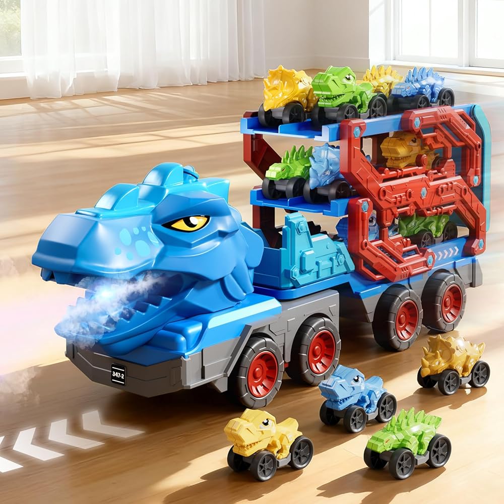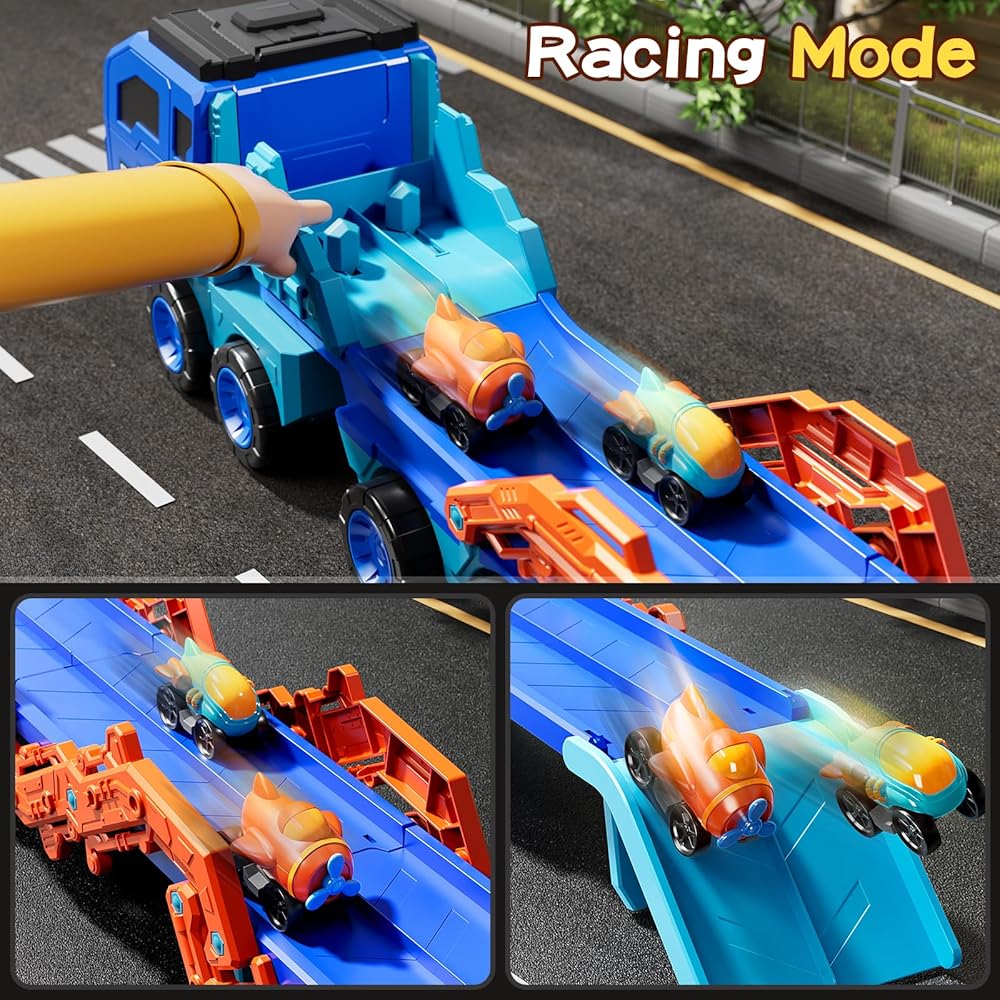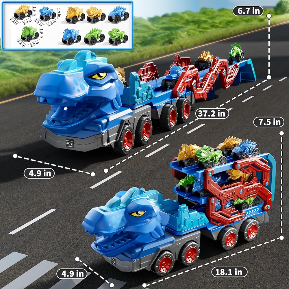 Transport Dinosaur Truck Car Toys For Kids Boys - All 3 4 5 6 7 8 years old boys kids love cars! he large dinosaur truck toy itself is very suitable for playing and can also be used as storage space for 9 mini dinosaur cars. And the dinosaur truck also transforms into a 37 inch race track with a dual launcher for competitive racing and enjoy more fun.
