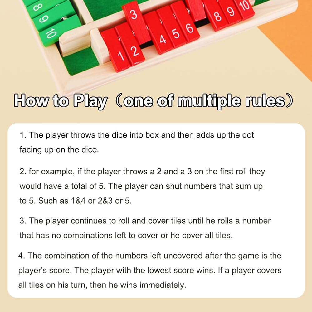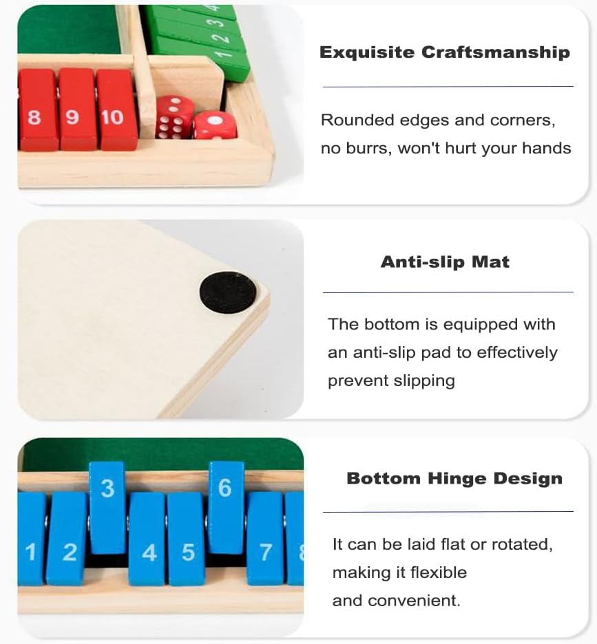 【Premium Solid Wood Construction】Crafted from natural pinewood with a felt playing surface, this shut the box game wooden edition combines durability with classic aesthetic appeal. The sturdy construction ensures years of reliable use while the felt lining reduces noise during gameplay.