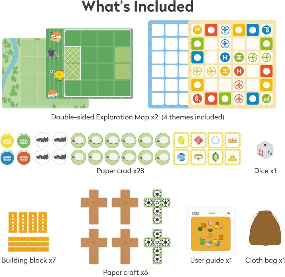 What's included in the box: Double-sided Exploration Map x2 (4 themes included), Paper crad x28, Paper craft x6, Building block x7, User Guide x1, Cloth bag x1, Dice x 1