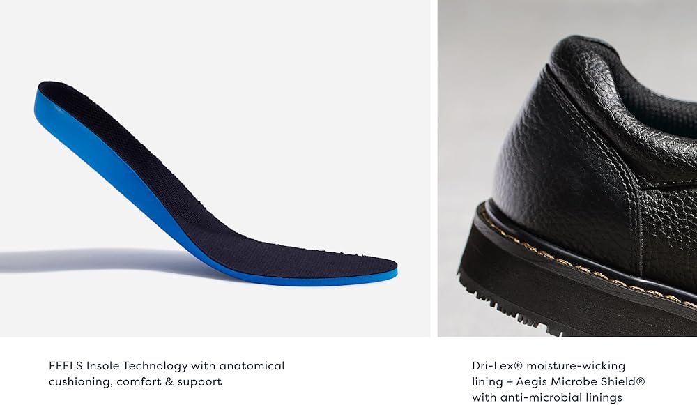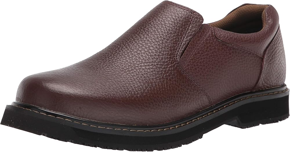 Professional work shoes for men with style and performance. PERFORMANCE TESTED: In independent lab testing, our mens work shoes beat industry average for comfort and cushioning. Oil-resistant, slip-resistant Lock Step Outsole™ meets SATRA TM63 and TM144 standards. MATERIALS: Majority leather, balance manmade. FIT: Mens slip on shoes for easy on/off. FEELS: Insole Technology with anatomical cushioning, comfort & support. MIDSOLE: Reduces foot pressure, absorbs shock, and moves with your foot. MOVEMENT: Lightweight construction moves with you. STYLE: Mens slip resistant dress shoes for work in an oxford style with non-marking rubber outsole.