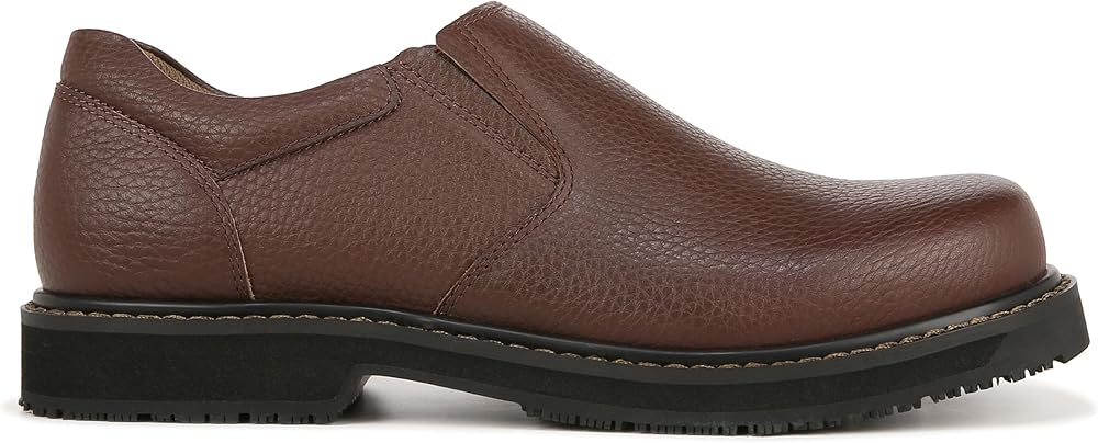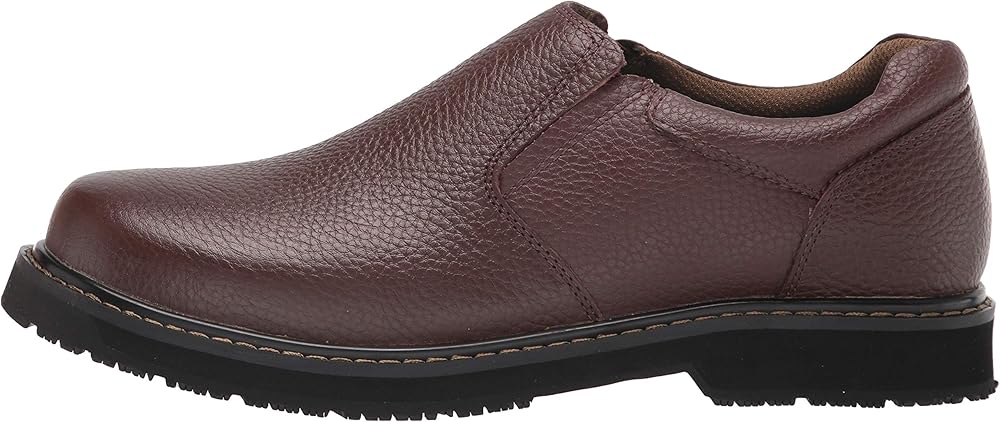 MATERIALS: A mens slip resistant slip on loafer with majority leather, balance manmade.