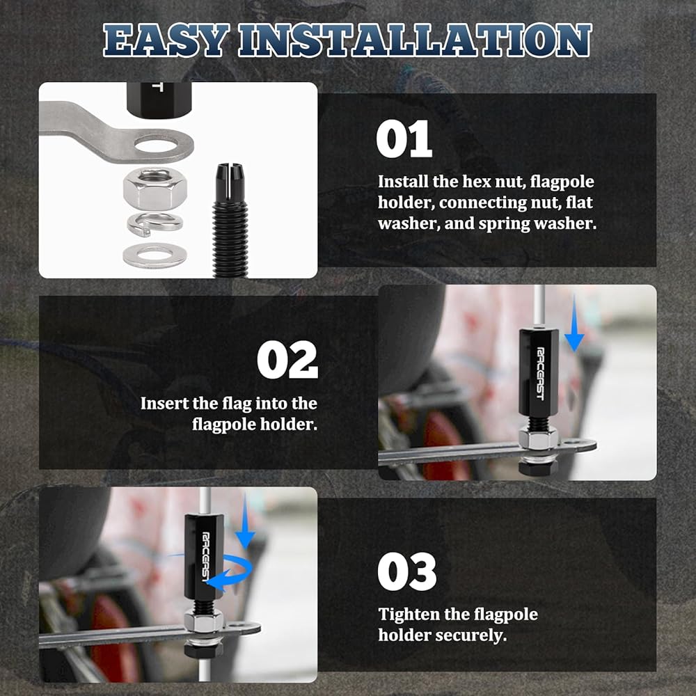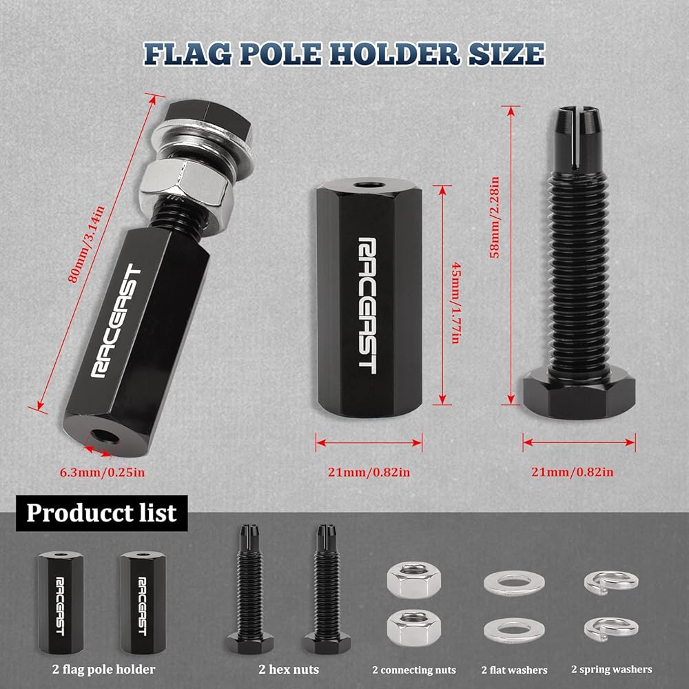 【Fitment】Raceast 1/4" flag pole holder designed for all your favorite ride styles—effortlessly mounts on ATVs, UTVs, motorcycles, off-road trucks, and dune buggies—perfect for hunting trips, desert off-roading, or weekend trail rides across the outdoor.