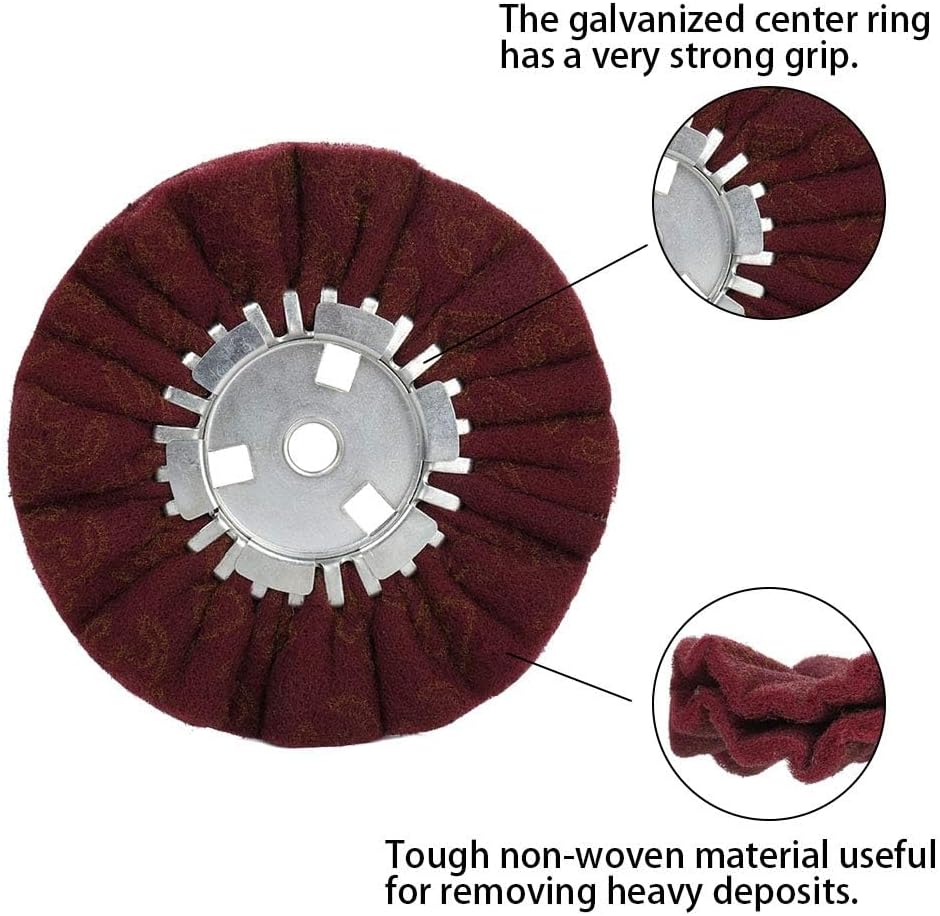 ●This Galvanized center ring forms wrinkles on the surface of the non-woven, the folds construction resists loading and runs cool, let buffing wheel is cooler than standard wheels which keep the abrasives cutting at a consistent rate,working for longer time. Wrinkles also help hold compound. The center ring clip is resit-corrosion, very strong and durable.
