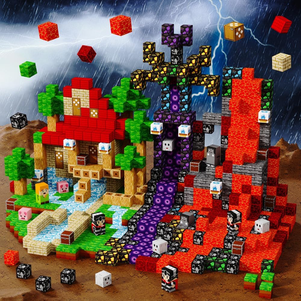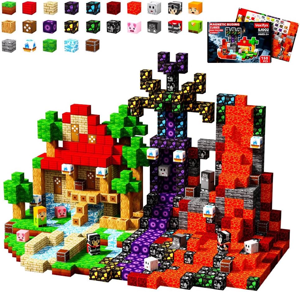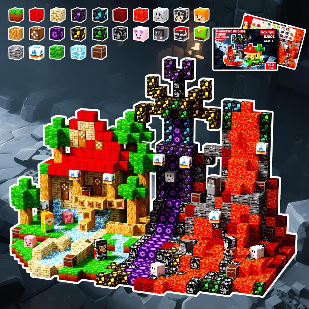 Magnetic toys come in various patterns, including 150 cubes with magnetic properties, suitable for children aged 3 and above, to stimulate interest and promote research. Several characters add stories to imaginative games.