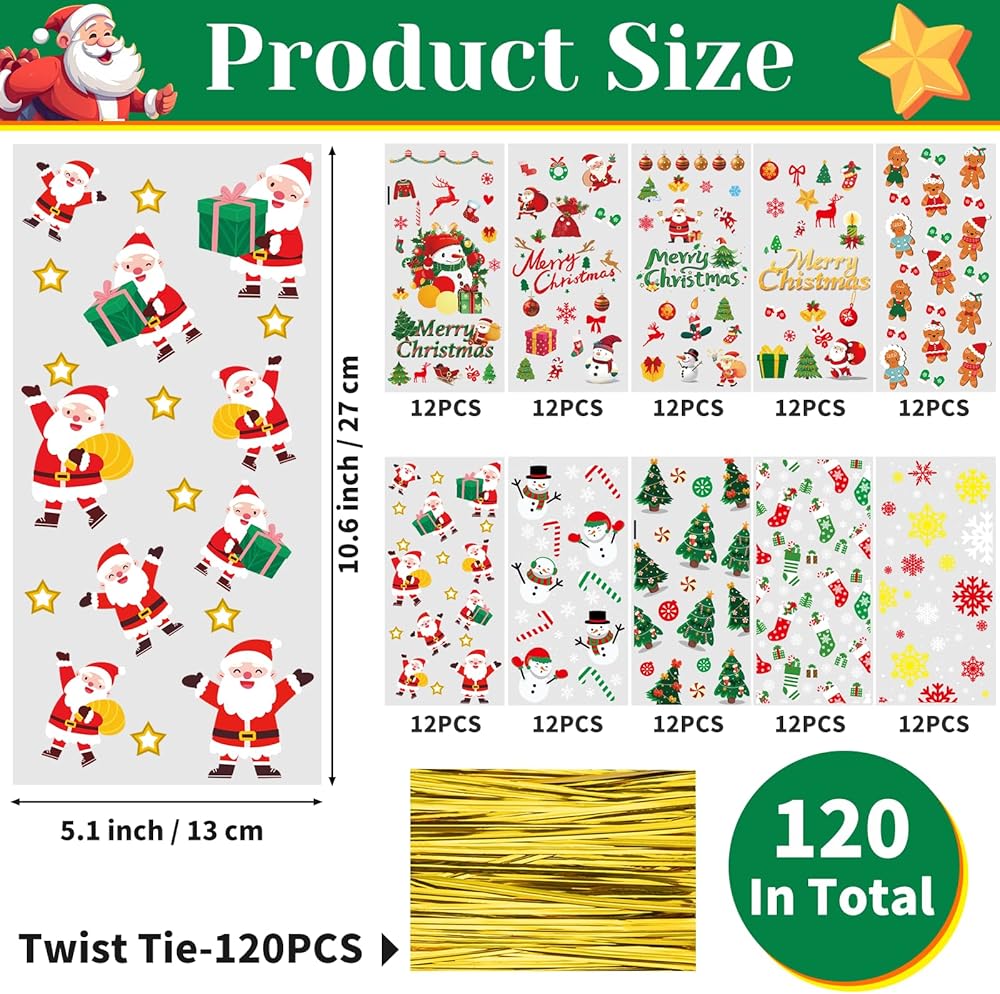 Value Package: Contains 120pcs 10.6x5.1 inch Christmas cellophane gift bags and gold twist ties, ensuring you have ample supplies to meet your Christmas party decoration, gift wrapping needs